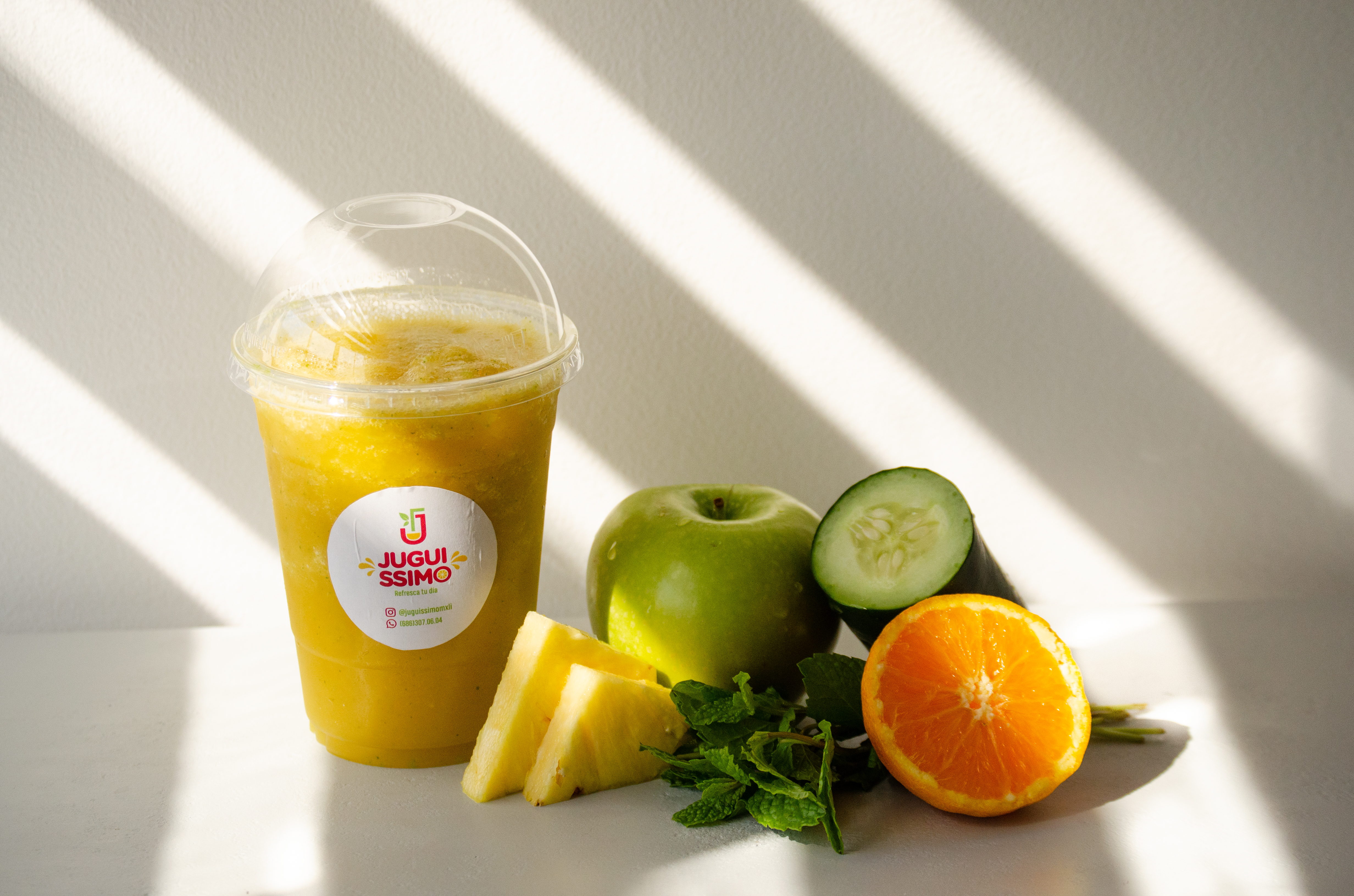 Jugo de naranja, manzana verde, piña, pepino y menta.