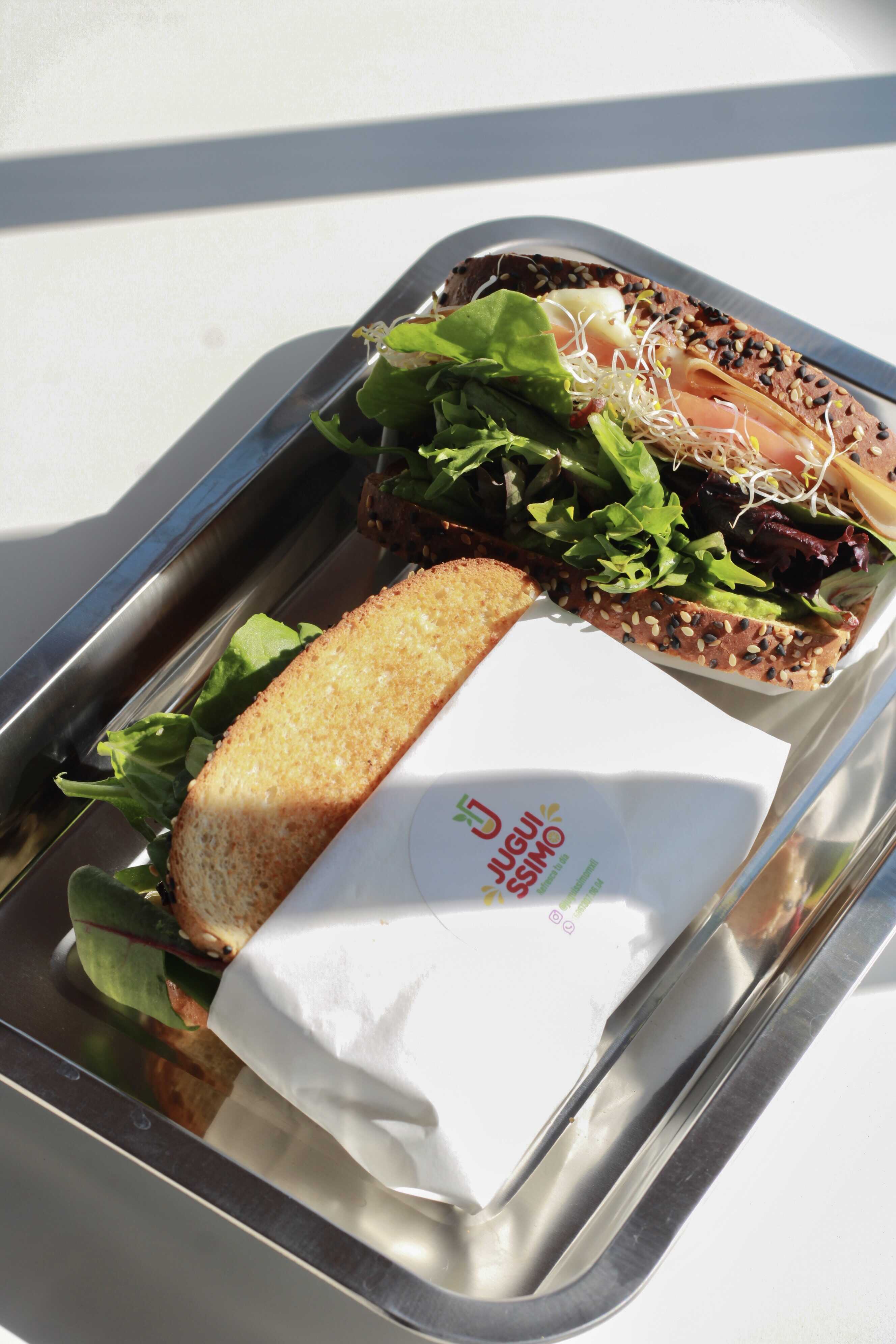 Pan de doce granos, pechuga de pollo, pesto, queso, chile morrón, tomate deshidratado, mix de lechuga y aguacate.