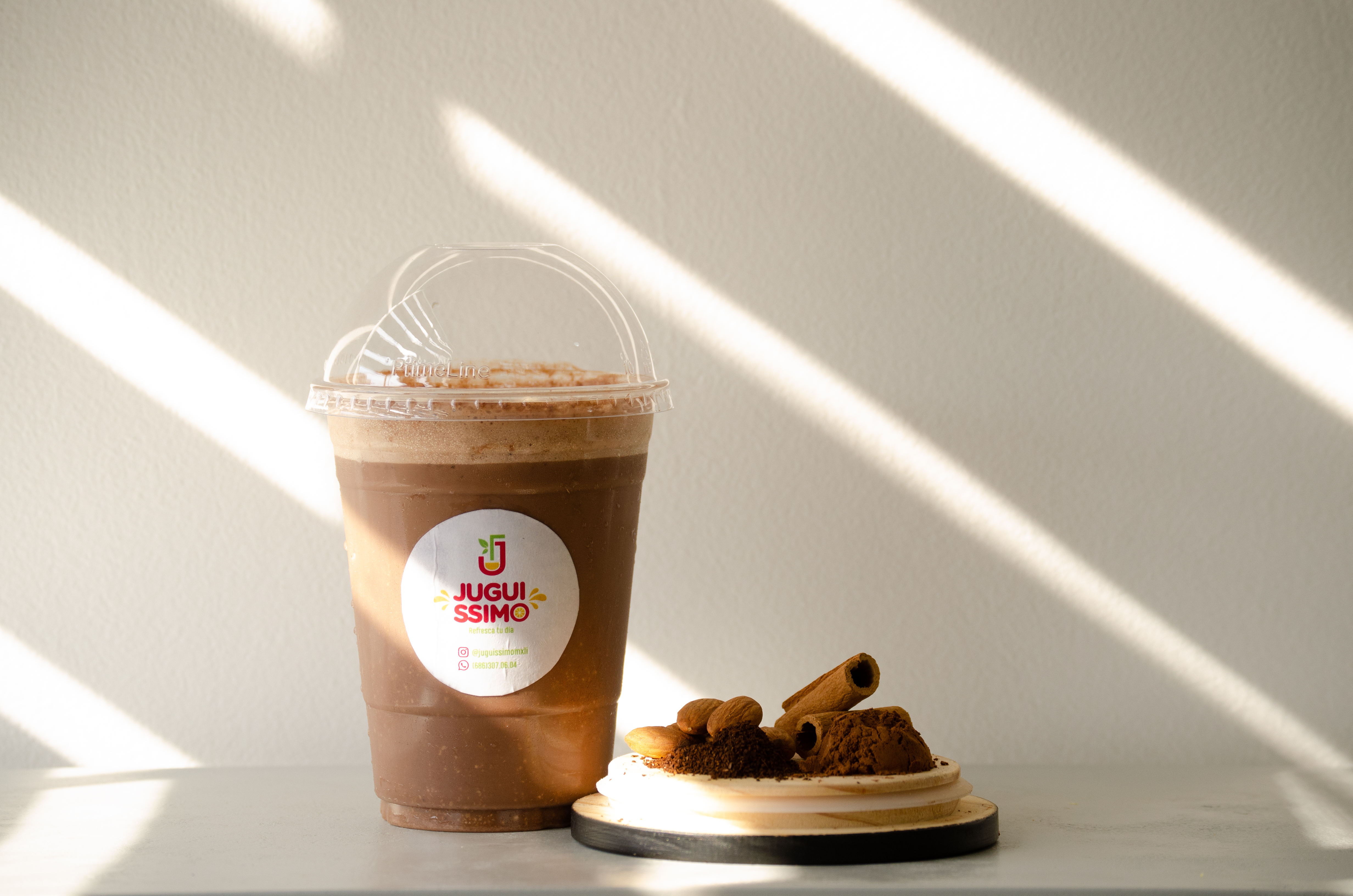 Smoothie con leche, plátano, dátil, cocoa, crema de almendra, canela y shot de espresso.