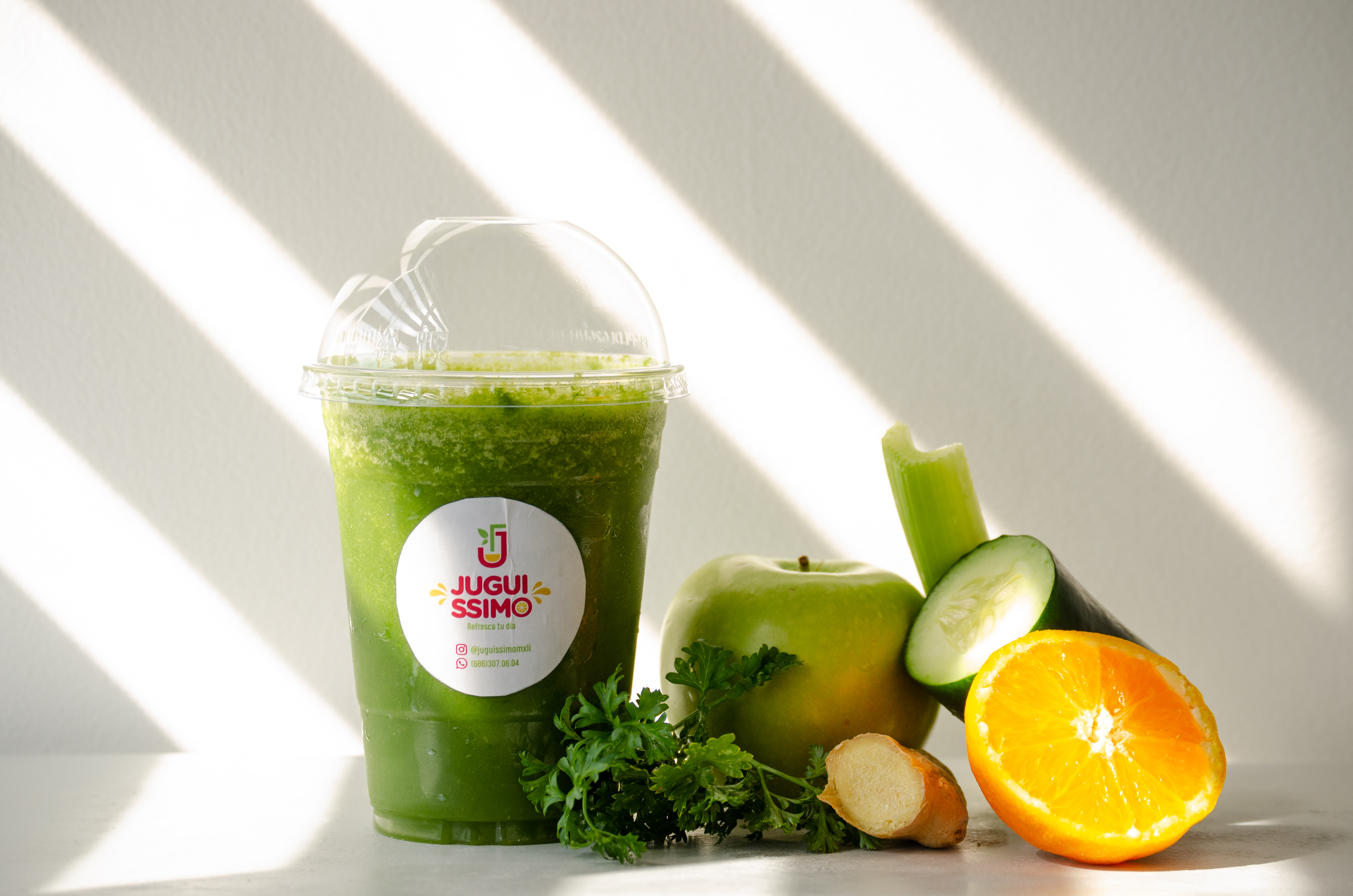 Jugo de naranja, piña, espinaca, apio, pepino, perejil y jengibre.