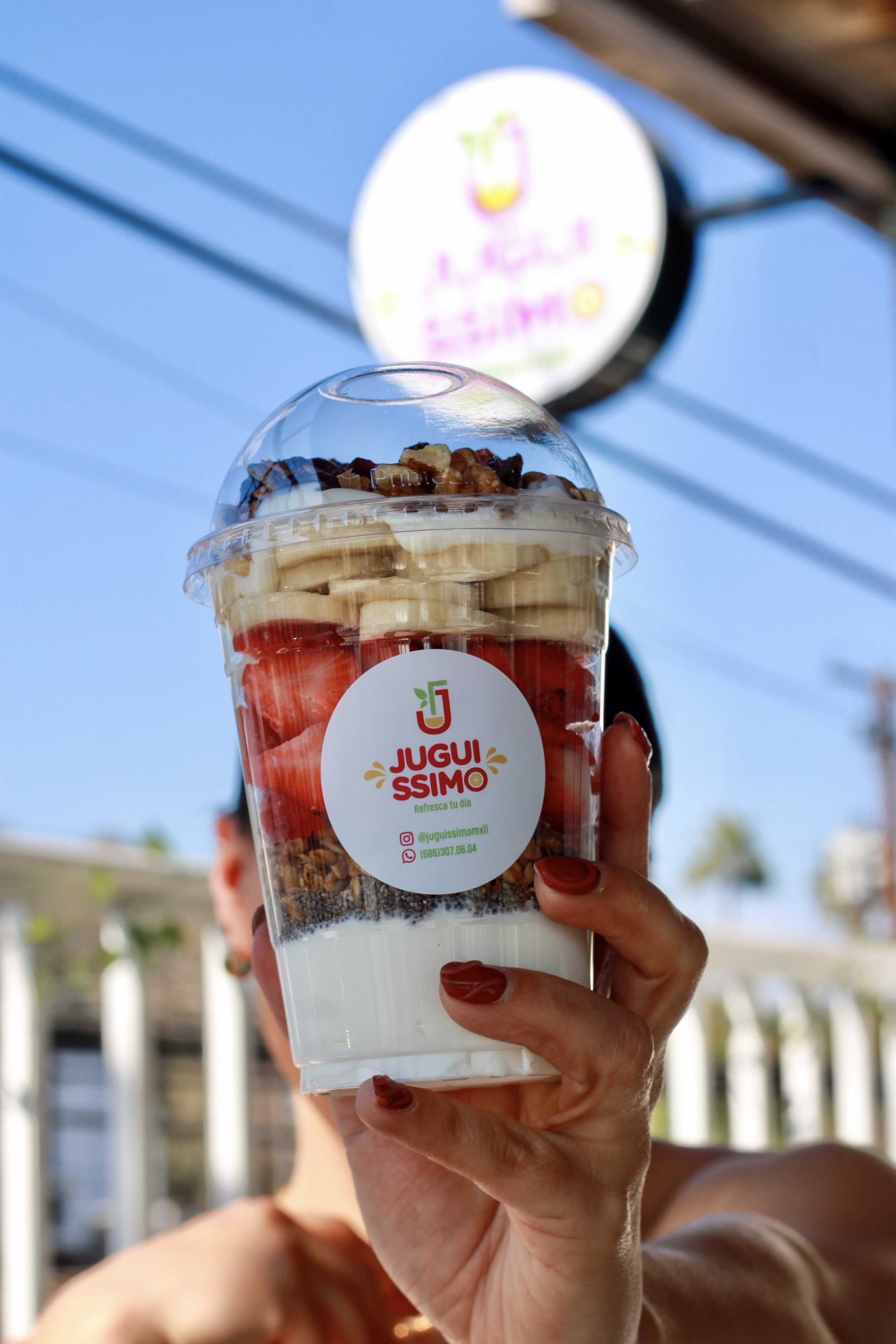 Yogurt griego natural sin azúcar, dos frutas a elegir, con granola, arándanos secos, nuez y miel de abeja.