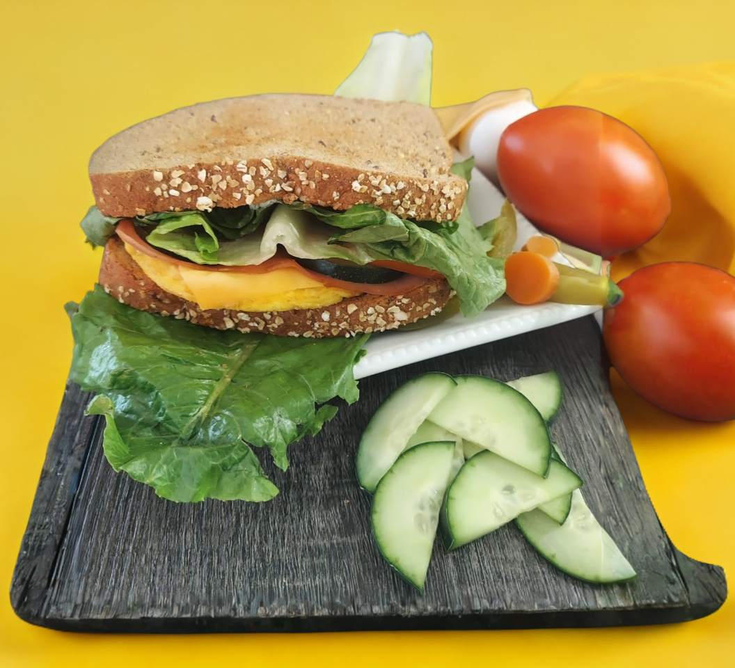 Sandwich de huevo con jamon y queso con opcion de agregar verduras.