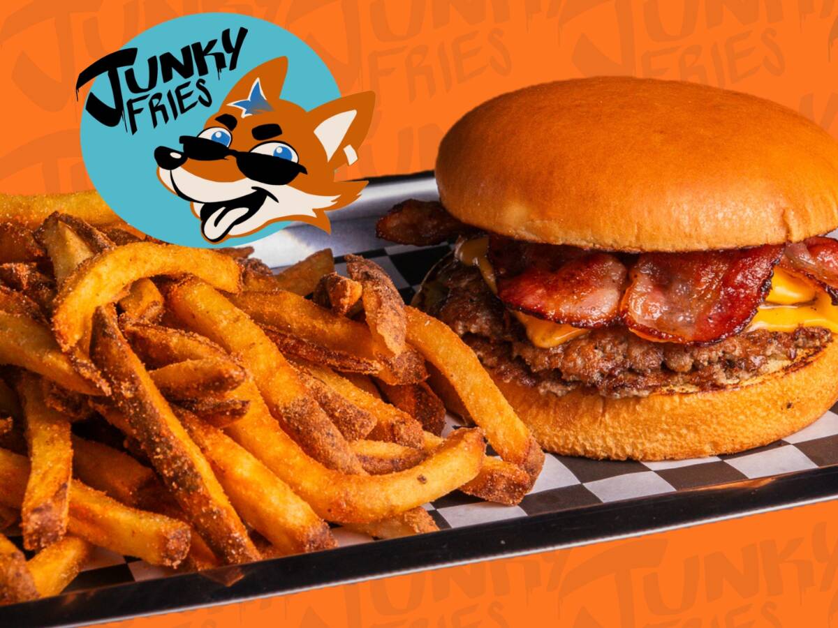 Smash burger con doble carne, queso derretido, tocino, aderezo Zoostyle, bañada en Junky Cheese y acompañada de papas fritas.