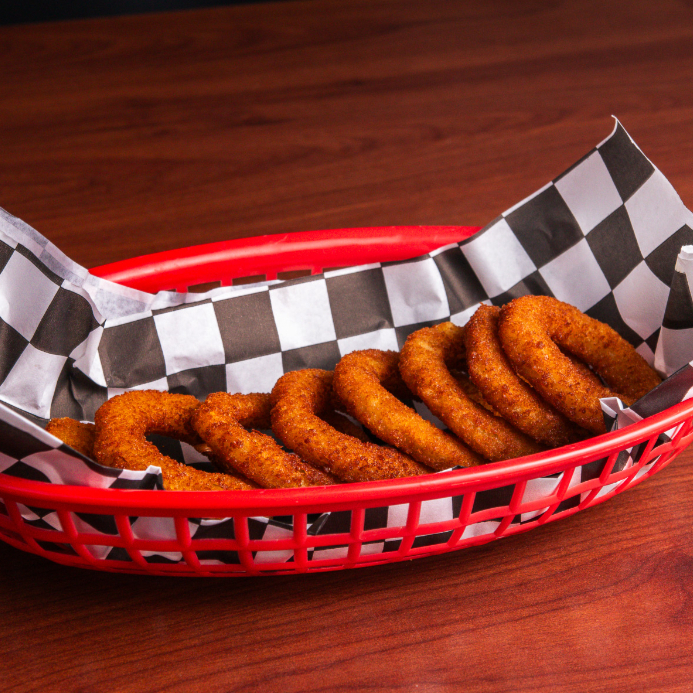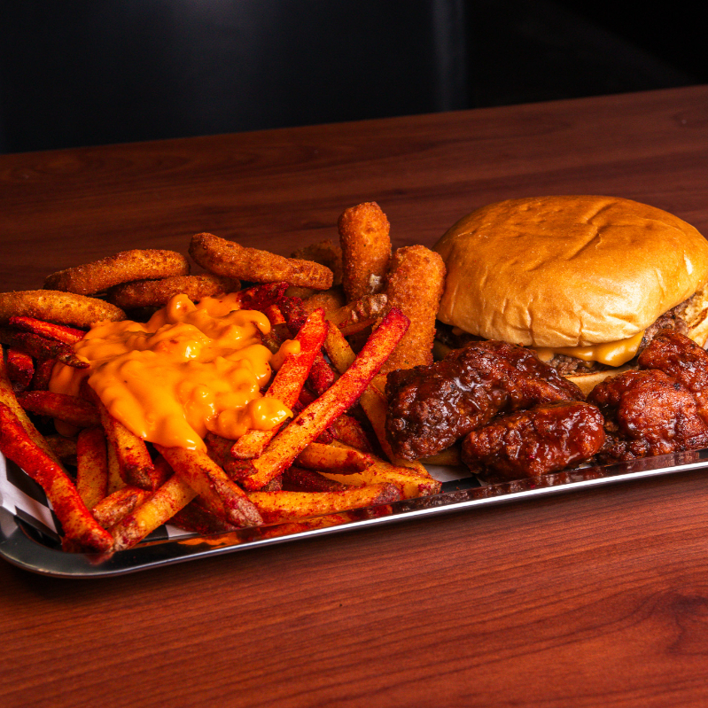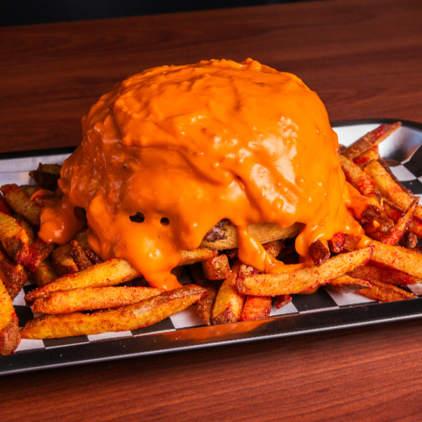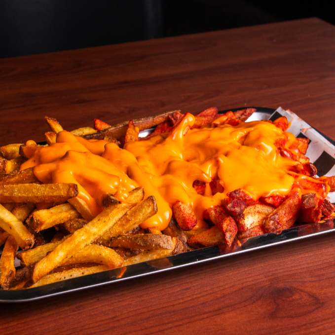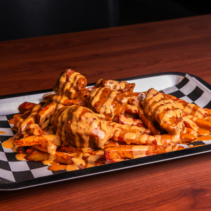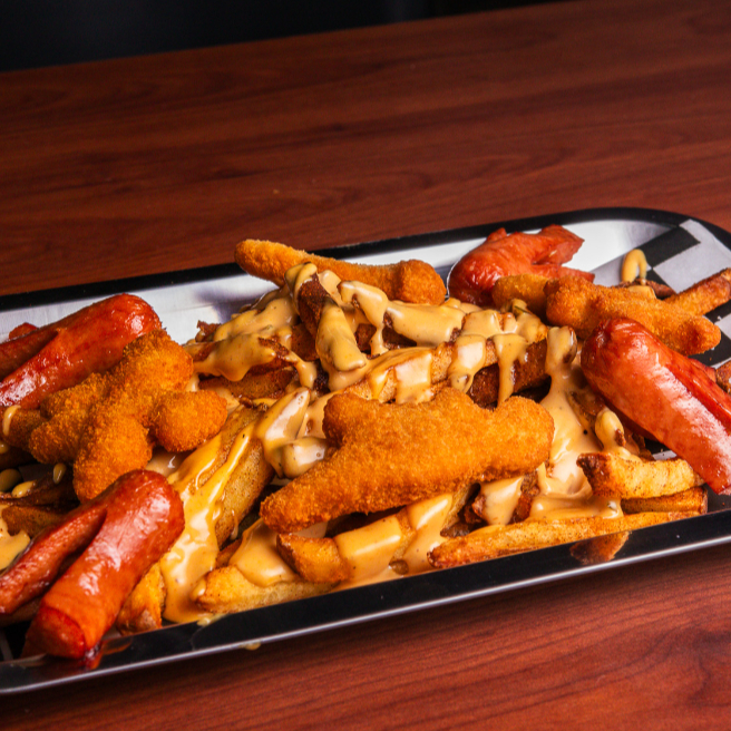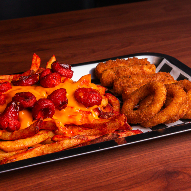 Cama de papas fritas con bubas, bañadas en Junky Cheese, acompañadas de dedos de queso y aros de cebolla.
