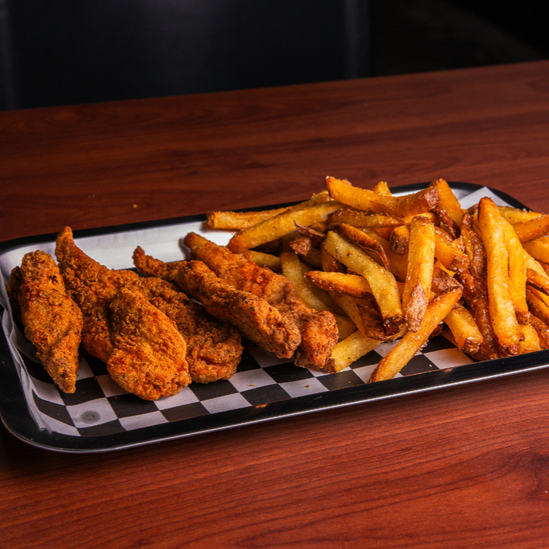 Tenders de pollo (200gr) acompañados de papas fritas.