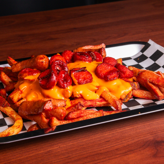 Cama de papas fritas con bubas, bañadas en Junky Cheese y acompañadas de salchipulpos.