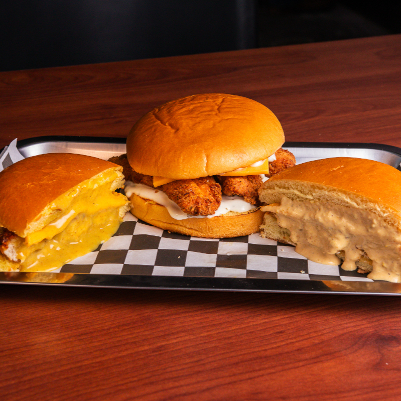 Chicken tender burger con queso derretido, aderezo Zoostyle y acompañada de papas fritas
