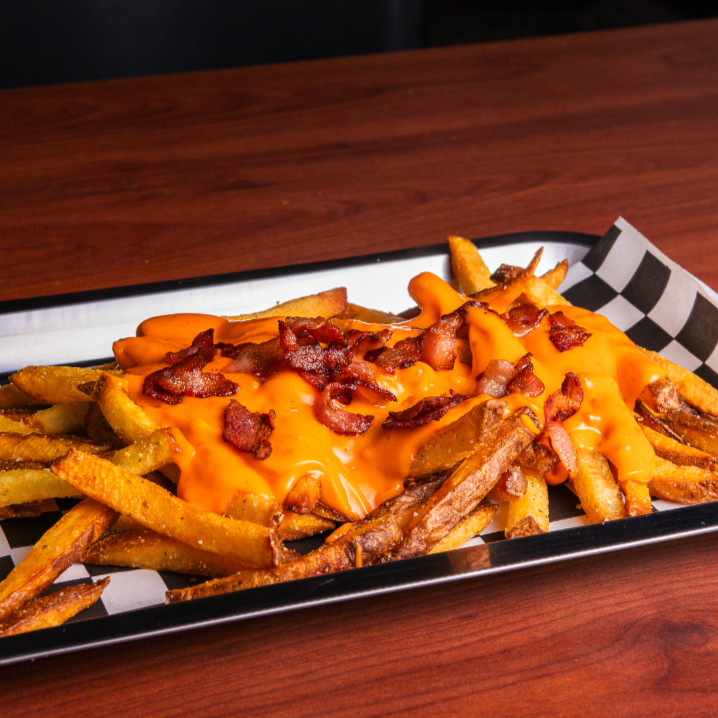 Cama de papas fritas bañadas en Junky Cheese y tocino.