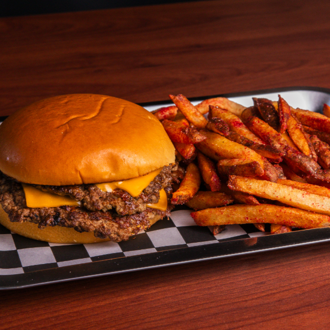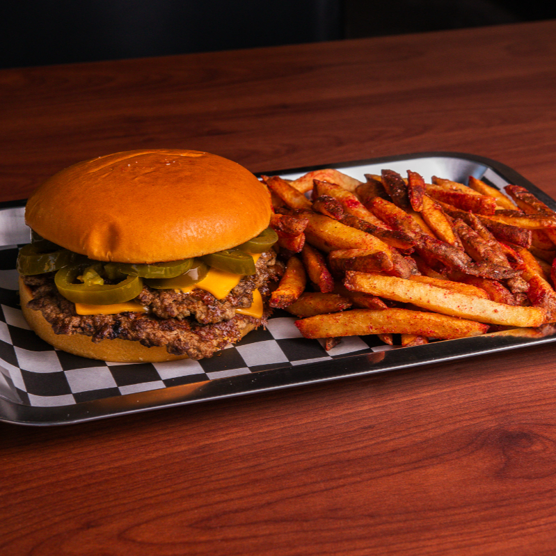 Smash burger con doble carne, queso, aderezo spicy Zoostyle, rodajas de jalapeño y acompañada de papas fritas