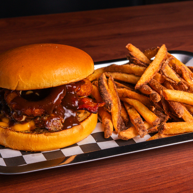 Smash burger con doble carne, salsa BBQ, queso derretido, aros de cebolla, tocino, aderezo Zoostyle y acompañada de papas fritas.