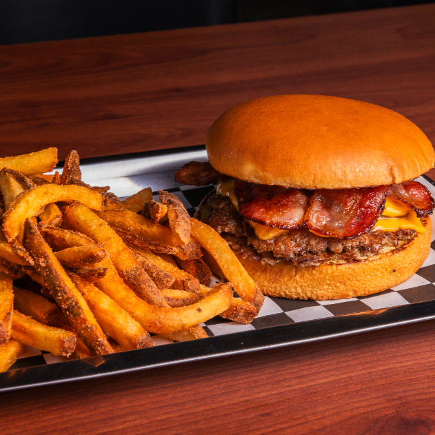 Smash burger con doble carne, queso derretido, tocino, aderezo Zoostyle y acompañada de papas fritas.
