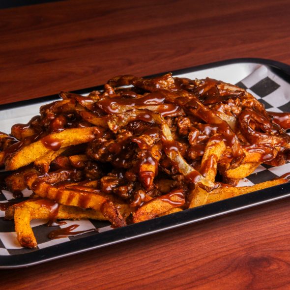 Cama de papas fritas cubiertas de carne molida con BBQ, cebolla frita y todo bañado en BBQ.