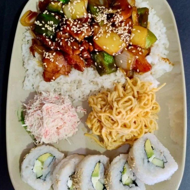 Pollo y res teriyaki sobre arroz blanco con medio rollo California, pasta y tampico.