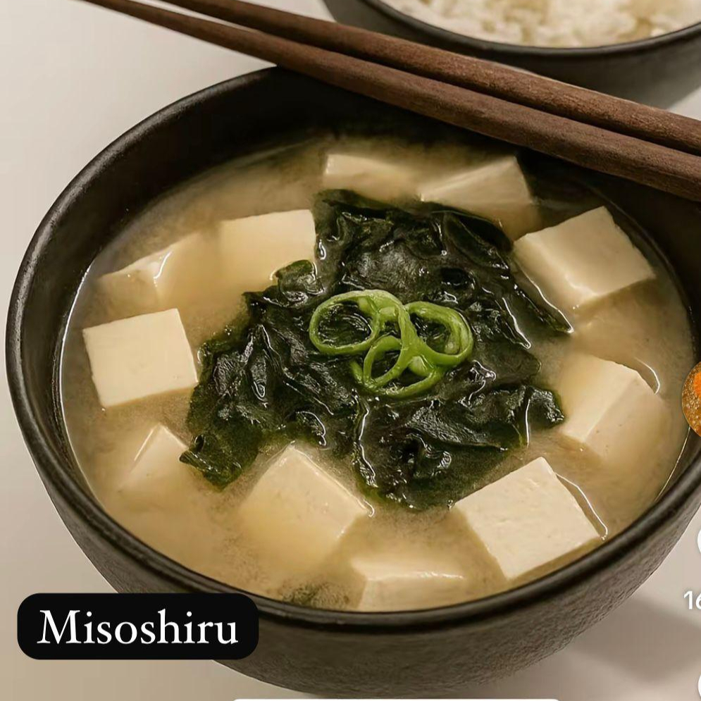 Sopa clásica a base de pasta de miso con cubos de tofu y cebollín fresco.