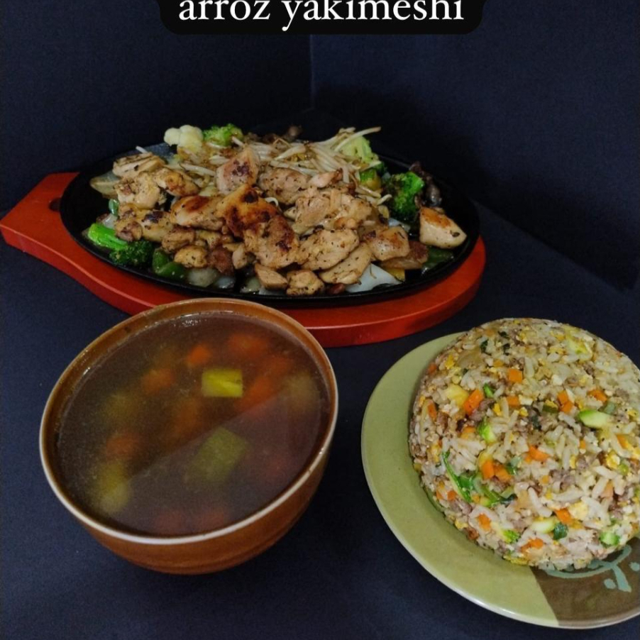 Corte de filete de res con verduras al teppan, incluye sopa y yakimeshi.