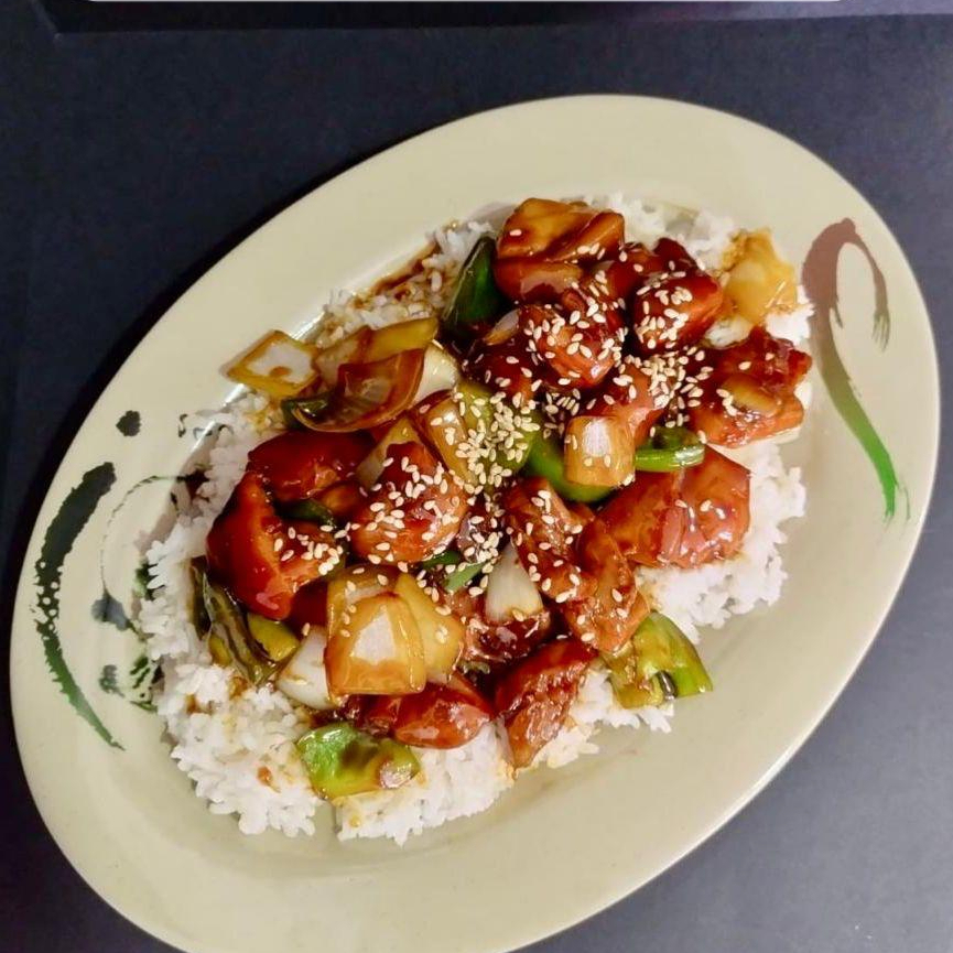 Pechuga de pollo empanizada con salsa especial agridulce sobre arroz blanco.