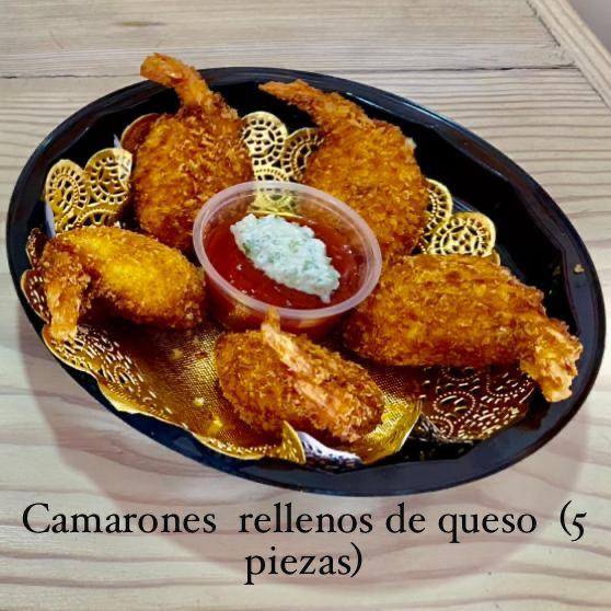 5 pzas De deliciosos camarones rellenos de queso suave y empanizados.
