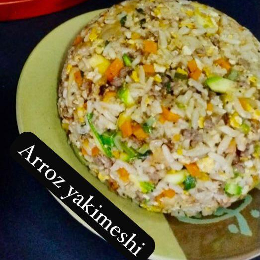 Arroz frito tradicional con carne, verduras picadas y huevo.