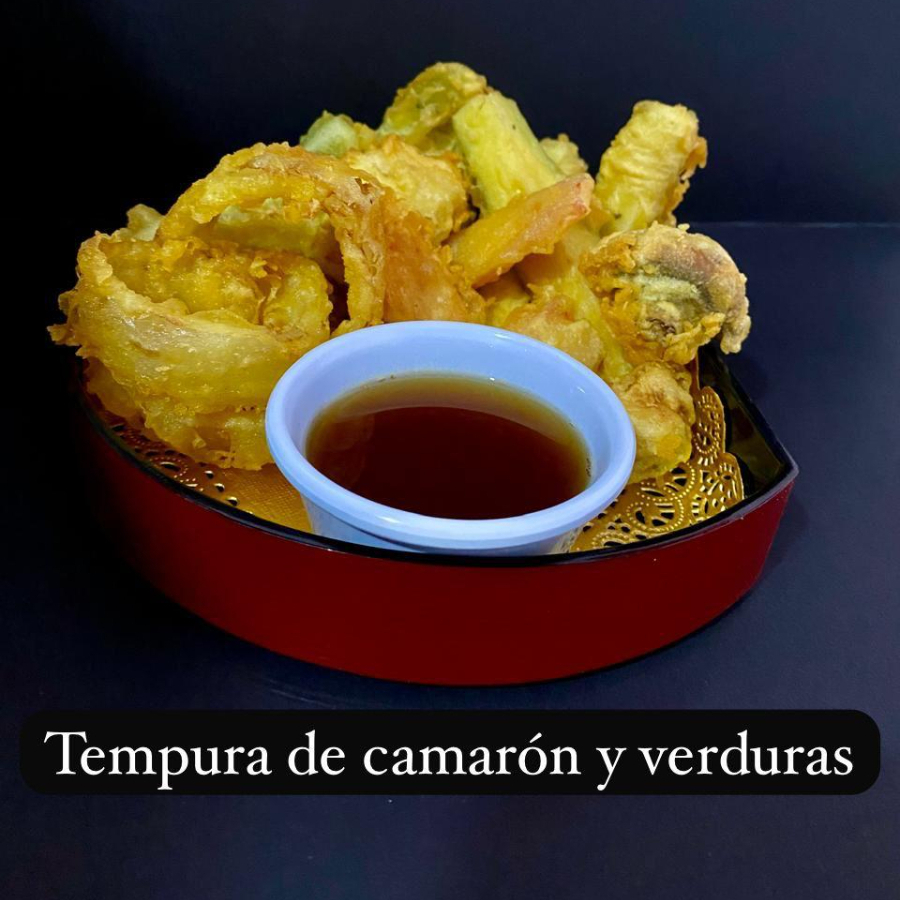 Combinación de camarón y verduras variadas capeadas en tempura crujiente.