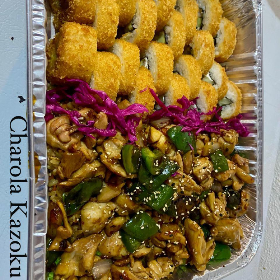 Pollo teriyaki sobre arroz blanco y dos rollos mar y tierra completos.