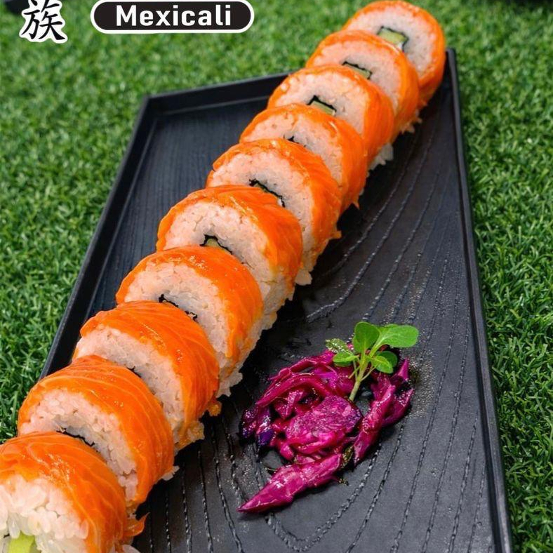 Camarón, queso crema y aguacate, forrado completamente de salmón fresco.
