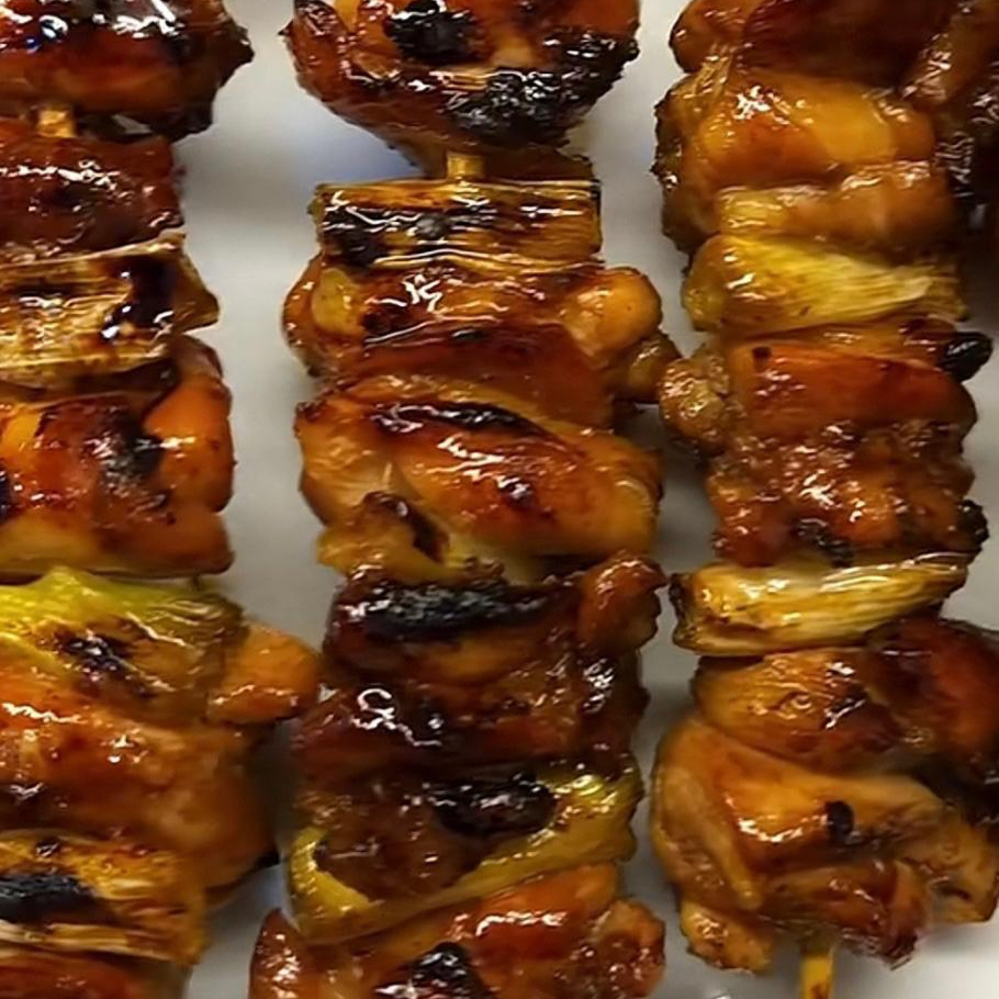 3 Brochetas de pollo con chile morrón y cebolla, bañadas en salsa teriyaki tradicional.