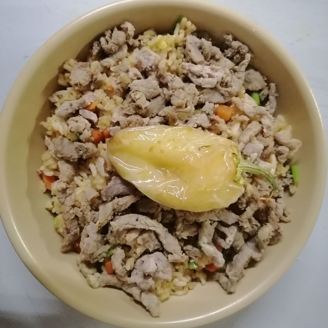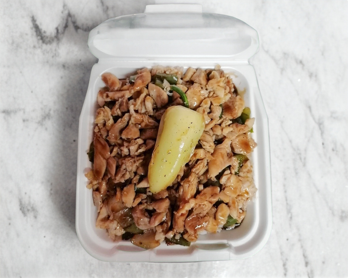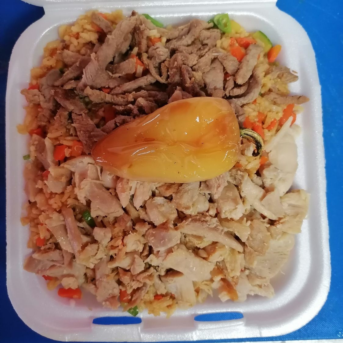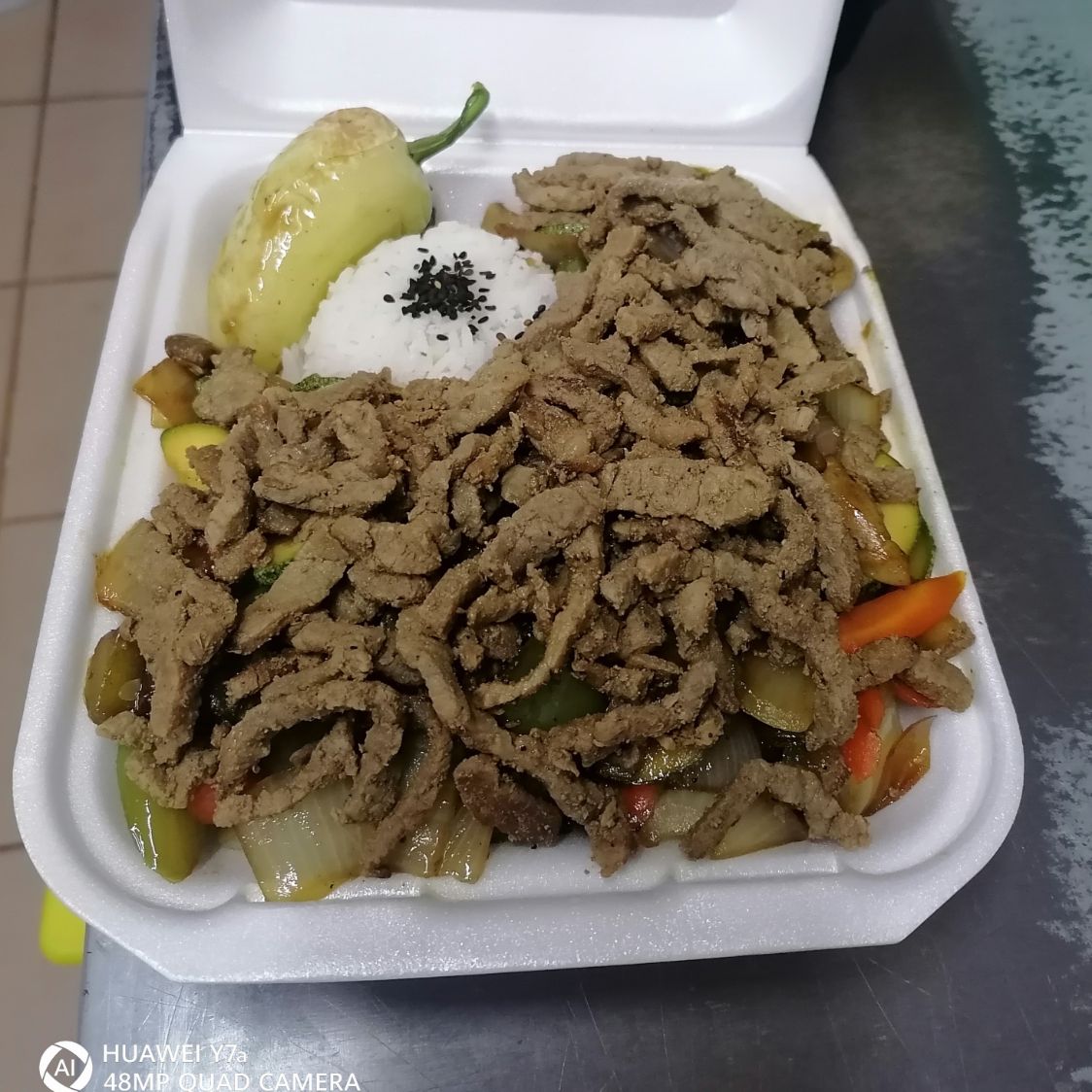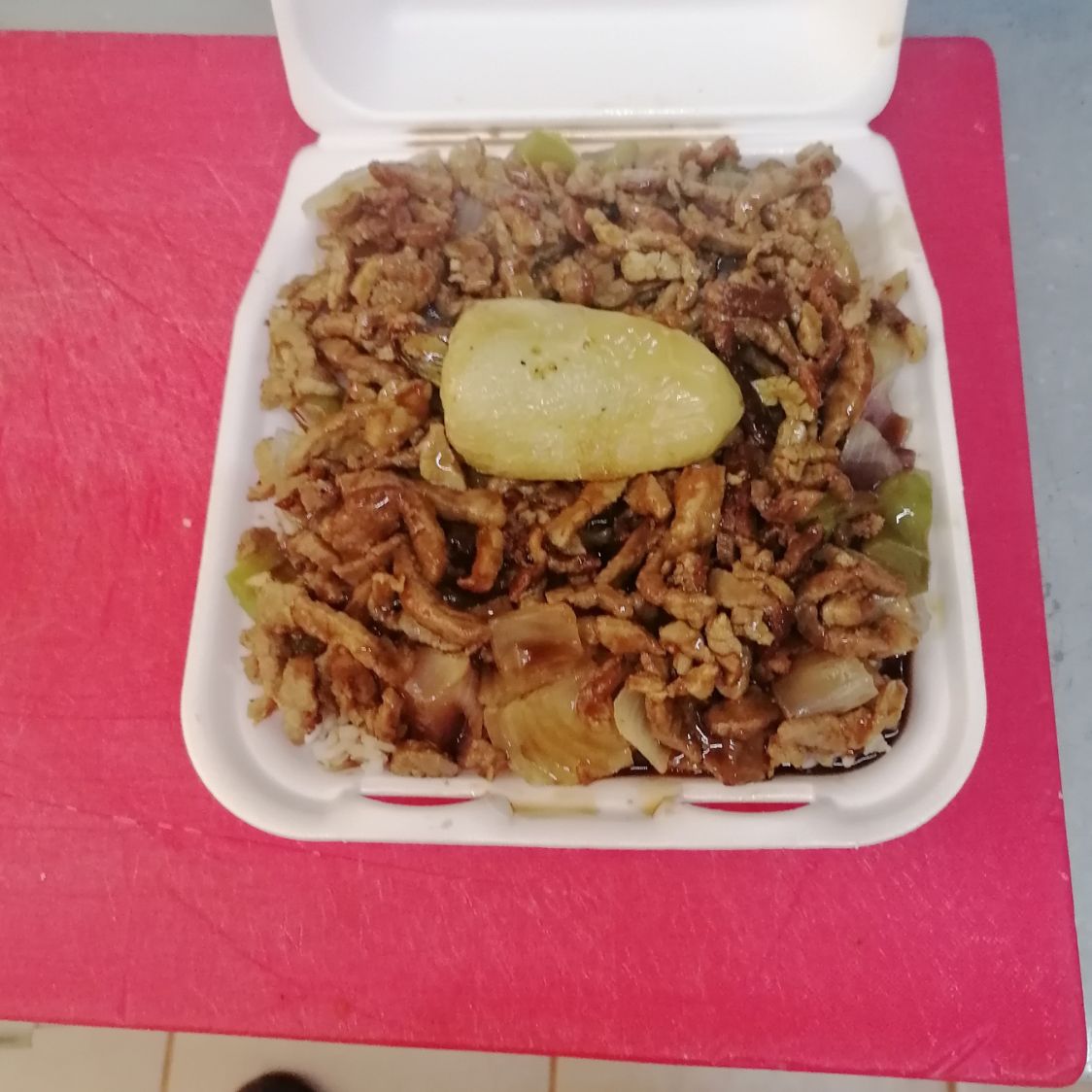 Cama de arroz blanco, morrón, cebolla, bañado en salsa teriyaki.
