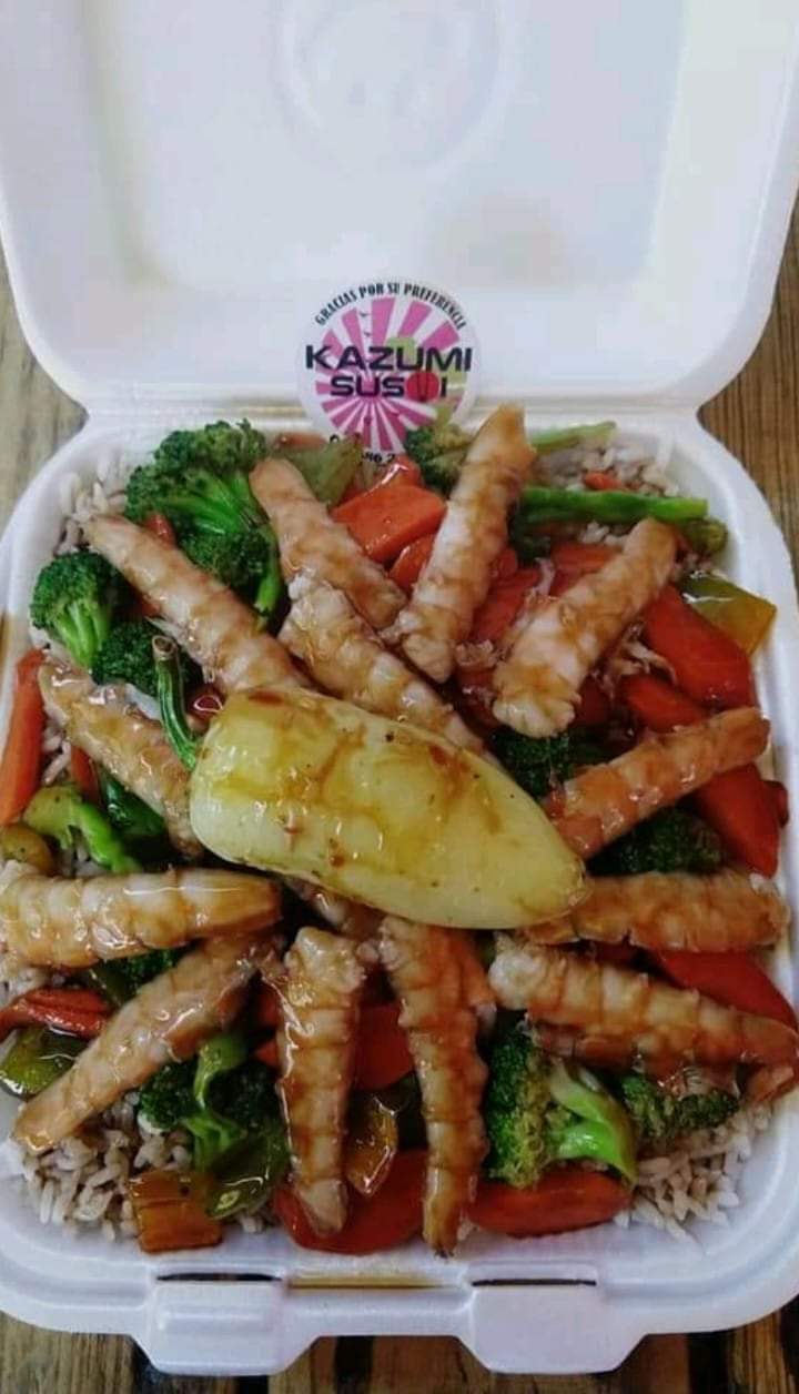 Acompañaod de verdura a la plancha, pimiento ,cebolla, camarones , calabaza y soya