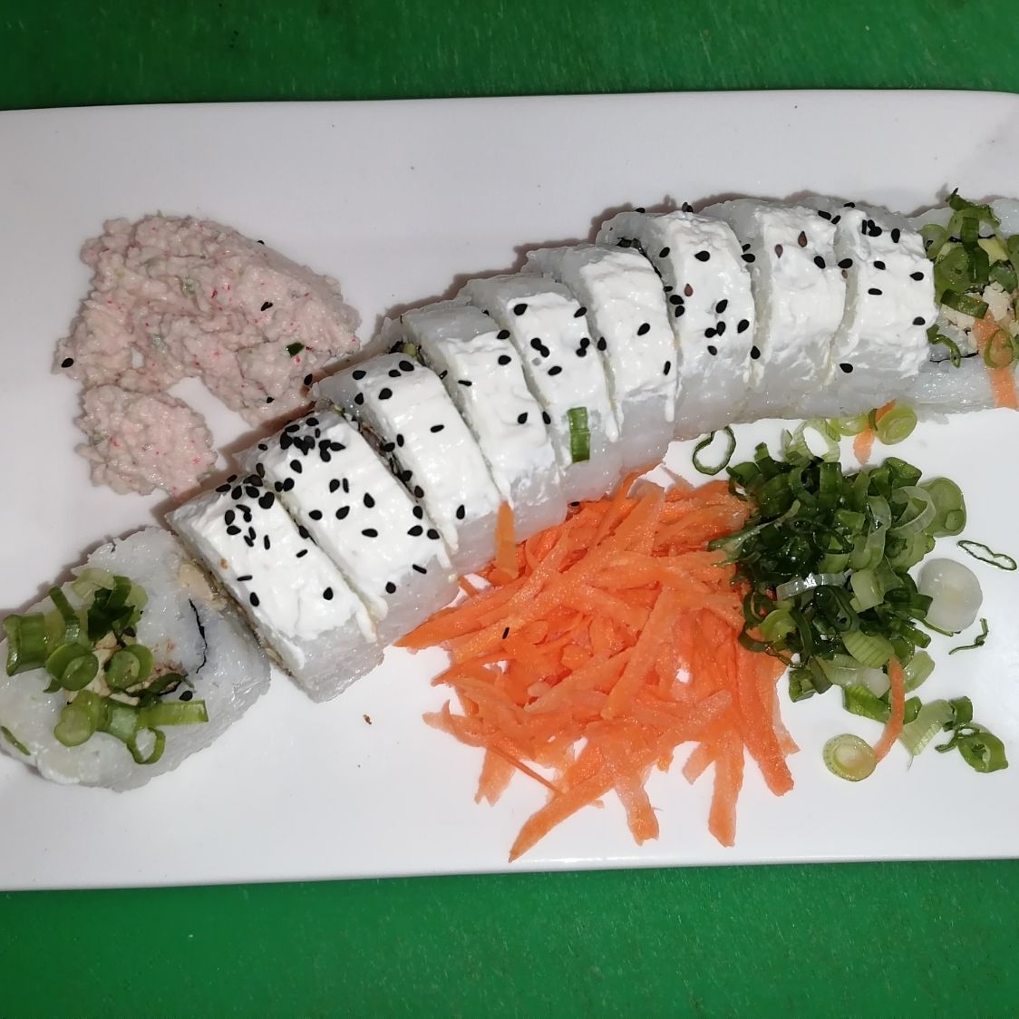 Camarón, pepino, aguacate y forrado de queso Philadelphia.