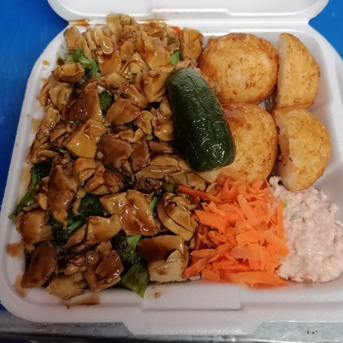 Pollo, zanahoria, cebollín, brócoli, queso, bañado en salsa teriyaki y chile.