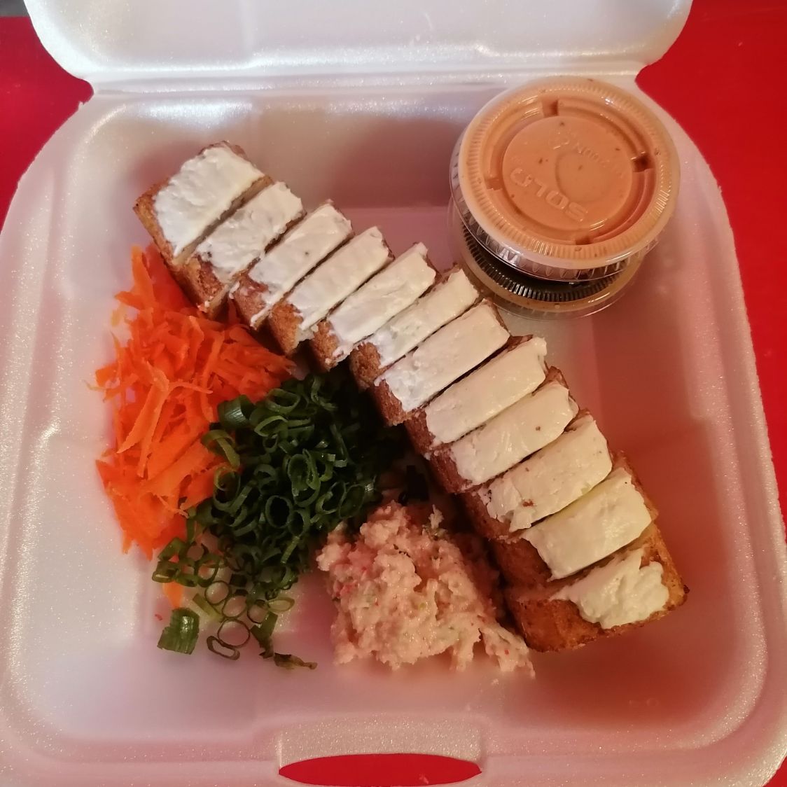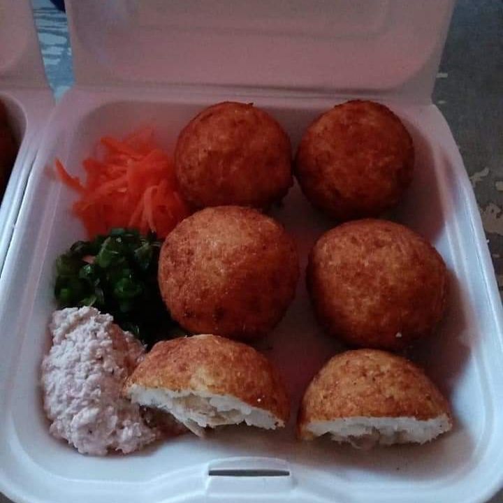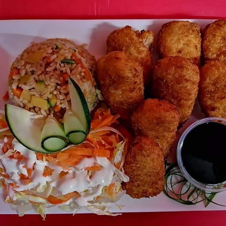 Arroz frito. Con verduras zanahoria calabaza y cebollín pollo y acompañado con bolitas de queso Filadelfia empanisado