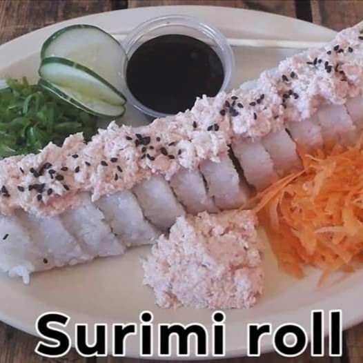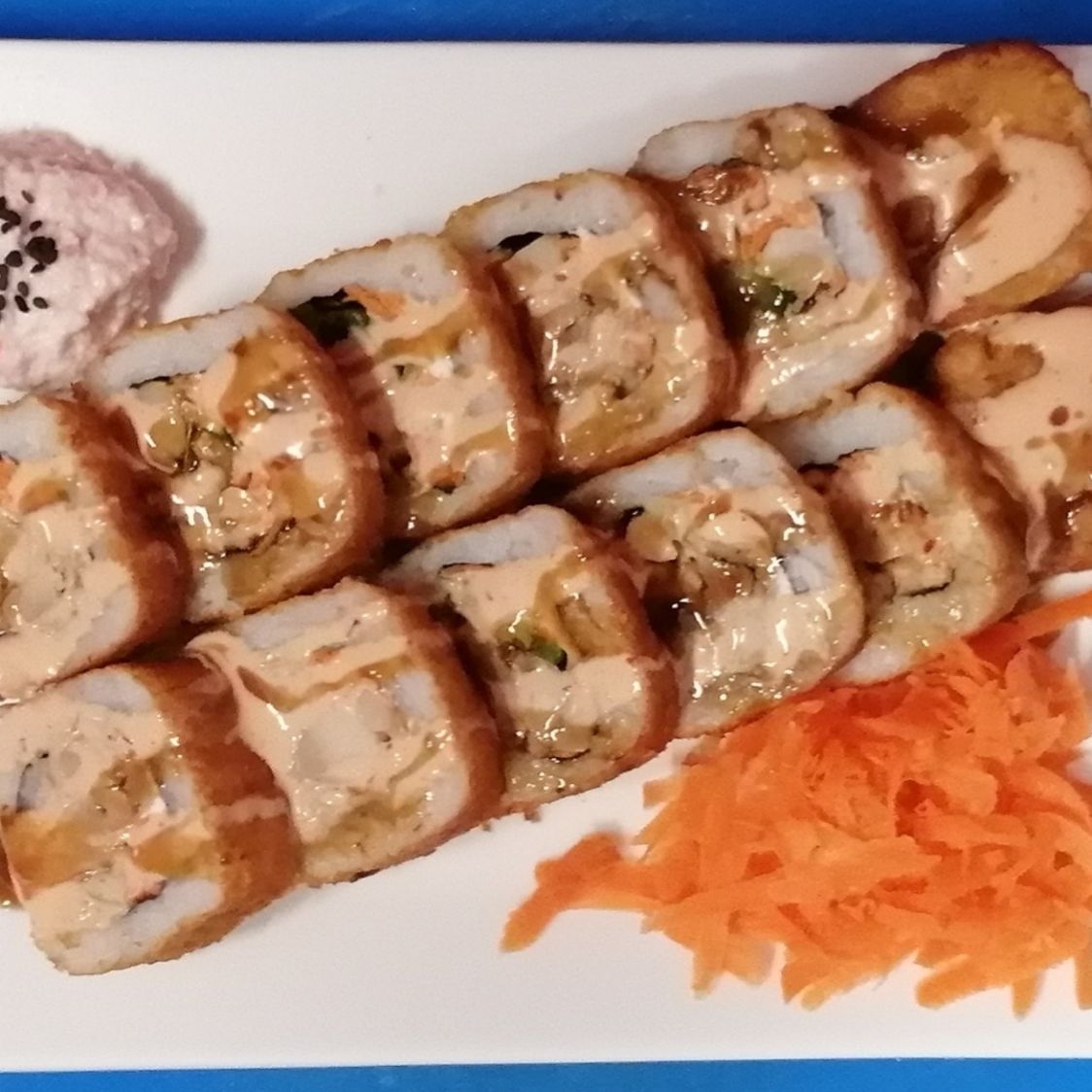 Cangrejo empanizado, aguacate, queso y forrado de tampico.