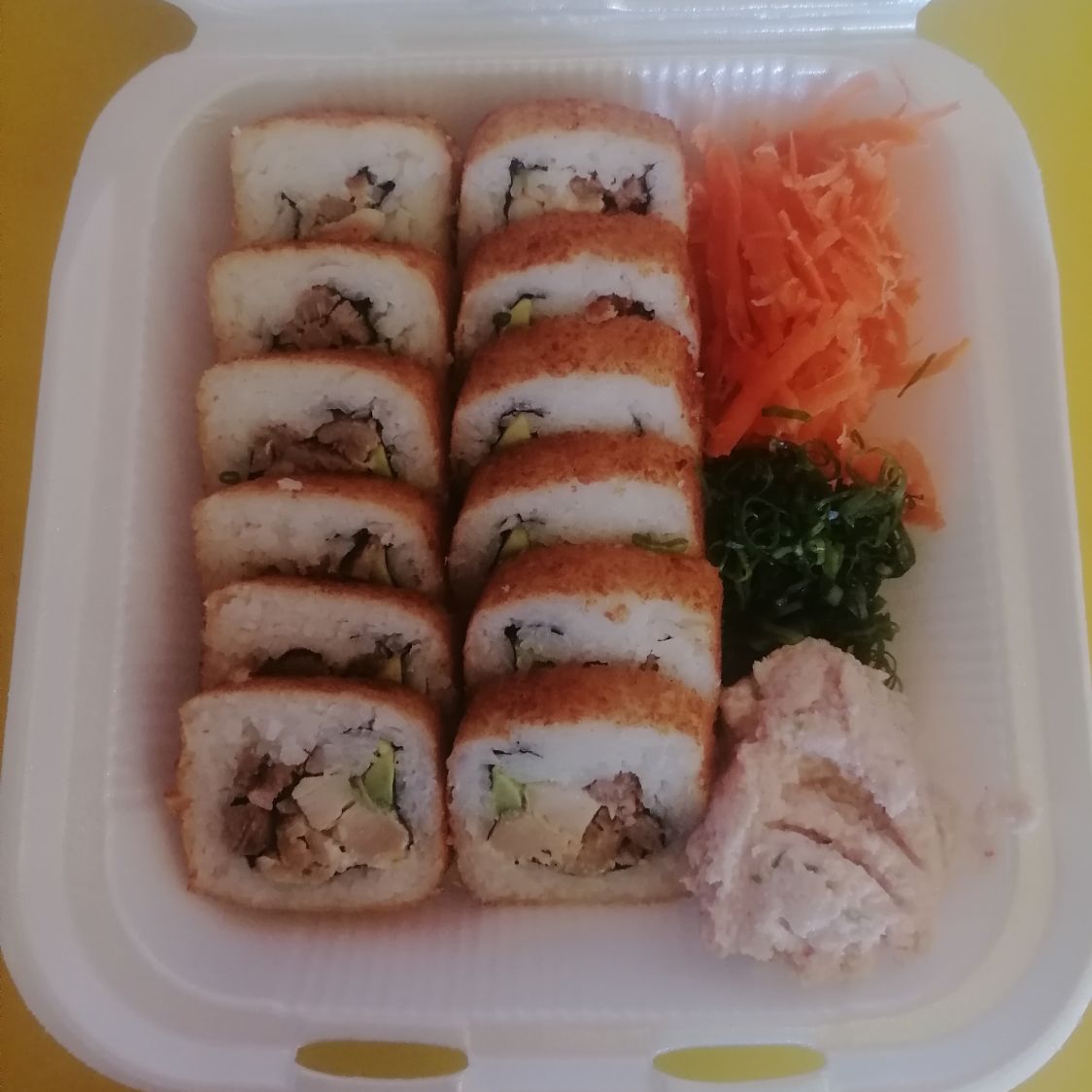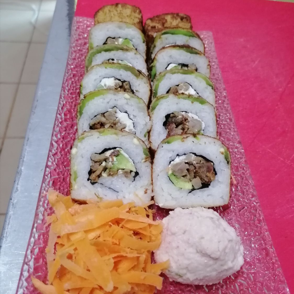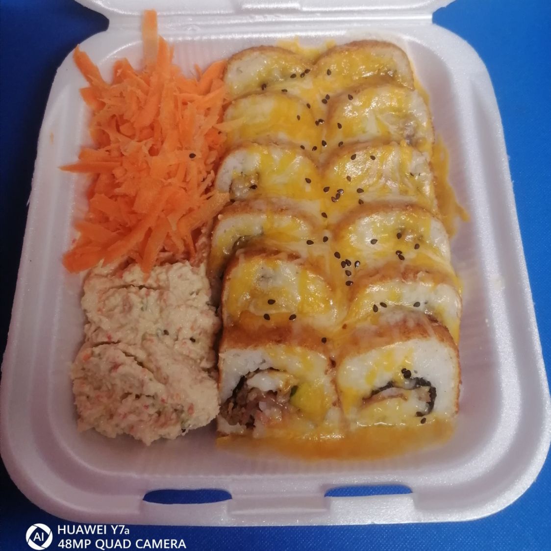 Contiene 2 rollos 1 cmt y un california de + porcion de teriyaki de pollo