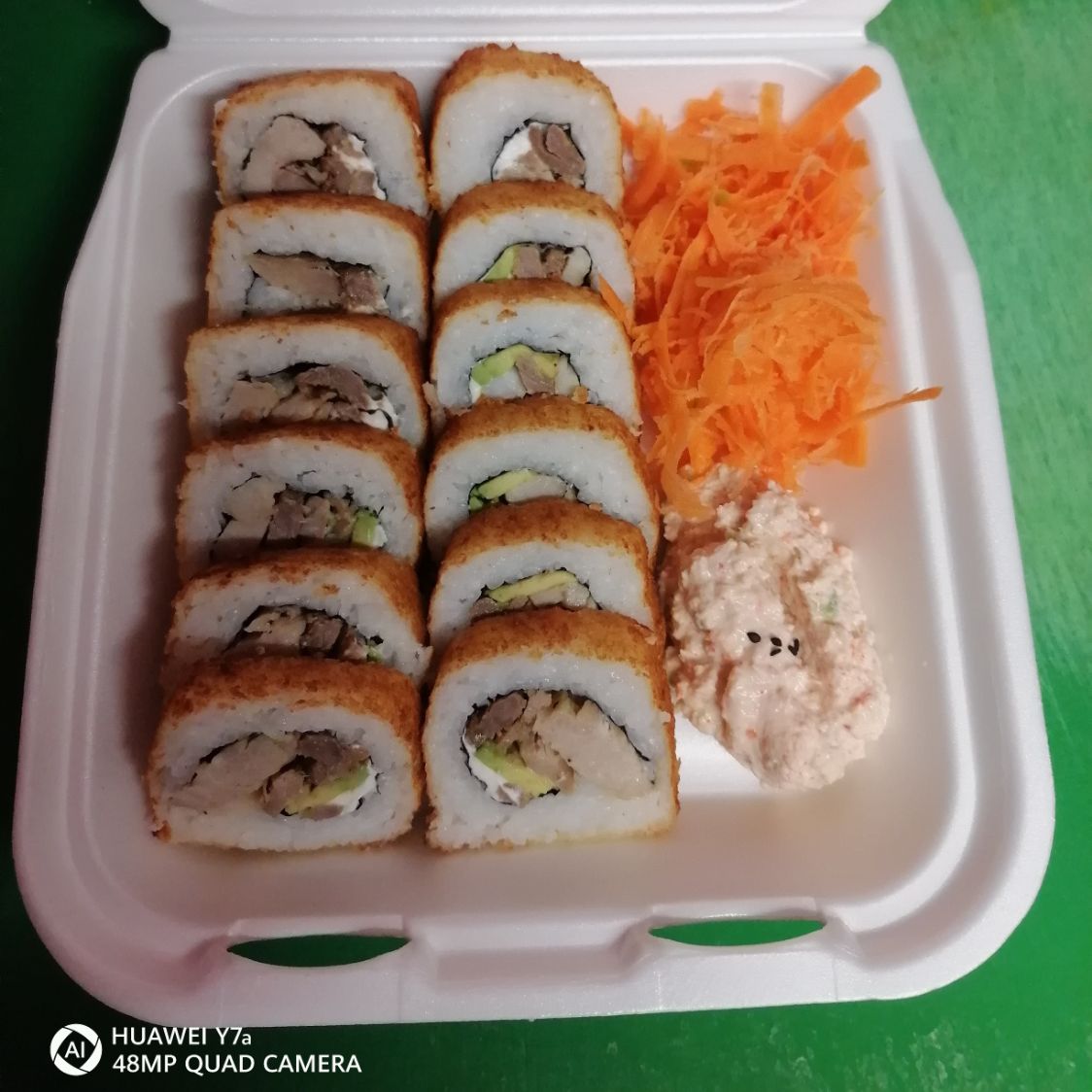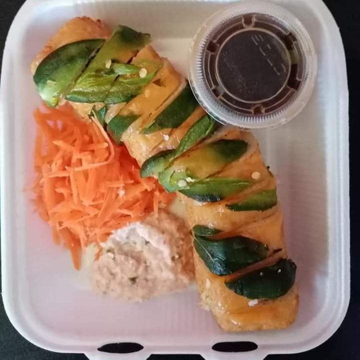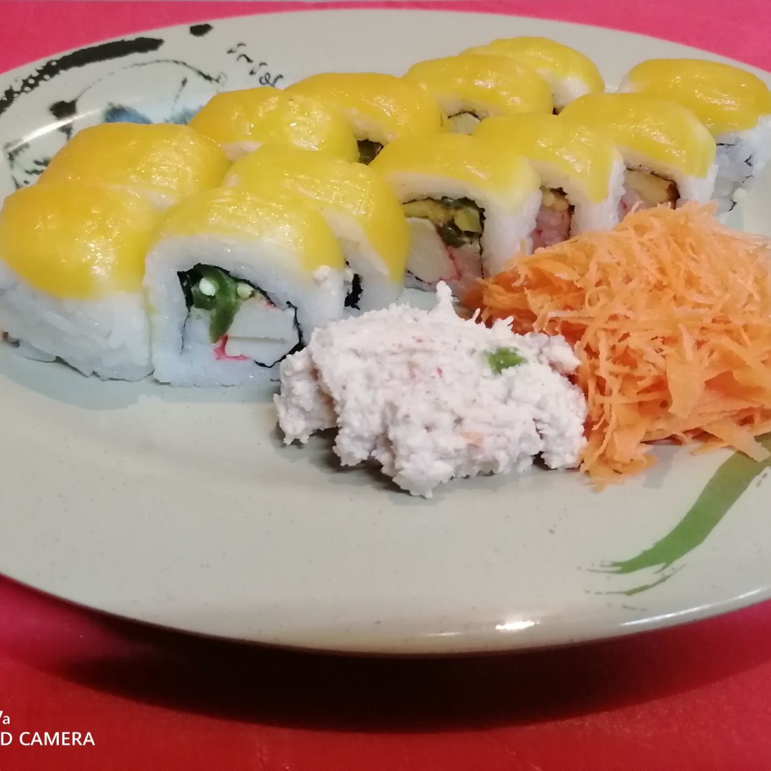 Contiene 2 rollos 1 cmt y un california de + porcion de teriyaki de pollo