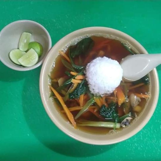 Brócoli, germinado de soya, zanahoria, calabaza, chile morrón, champiñones, cebolla blanca y acompañado de arroz blanco.