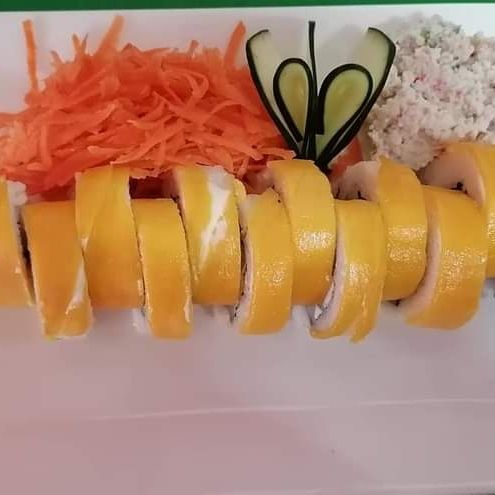 Camarón, pepino, aguacate, queso forrado de mango bañado en salsa dulce