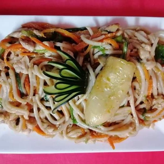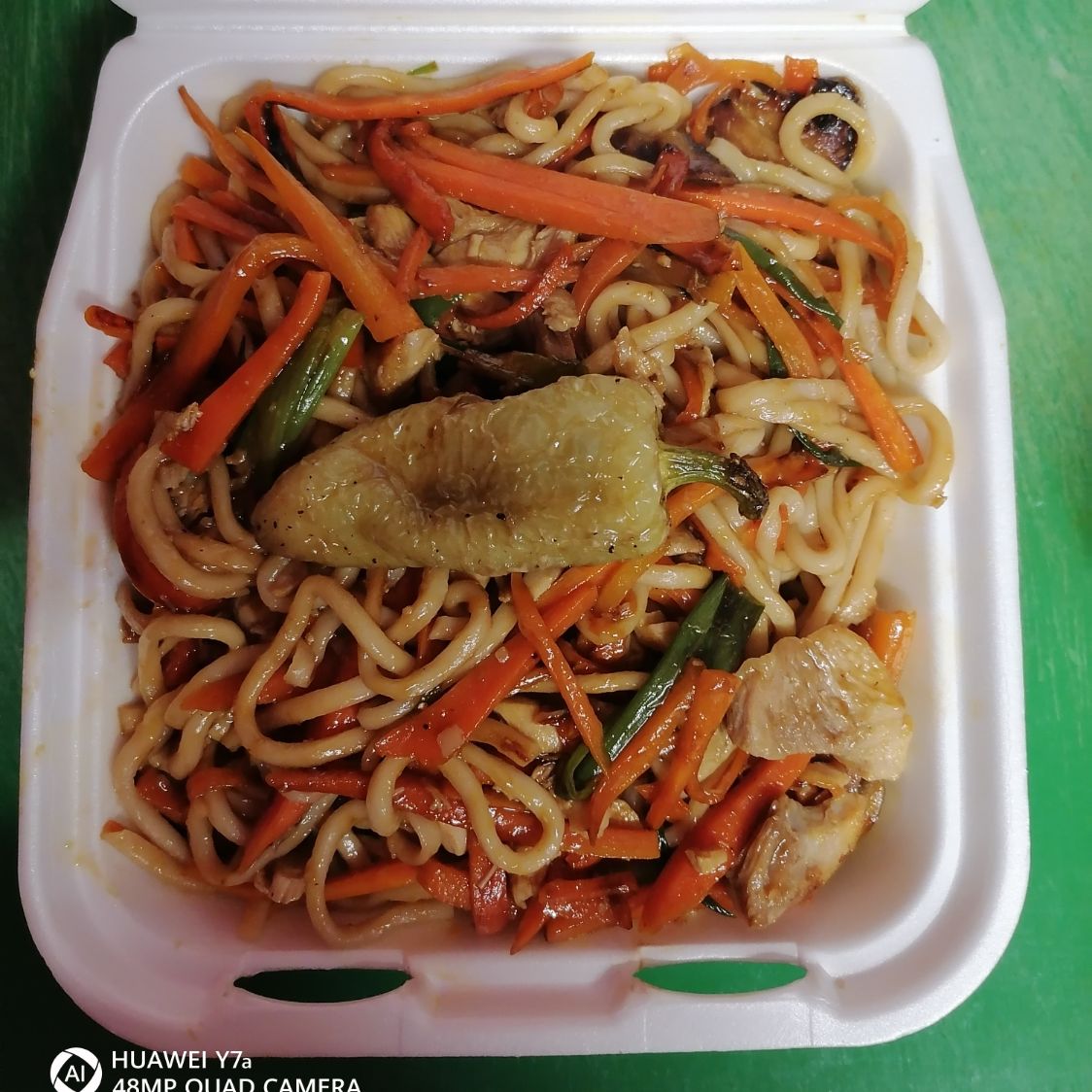 Yakiudon pasta, verduras, bañado en salsa de ostión.