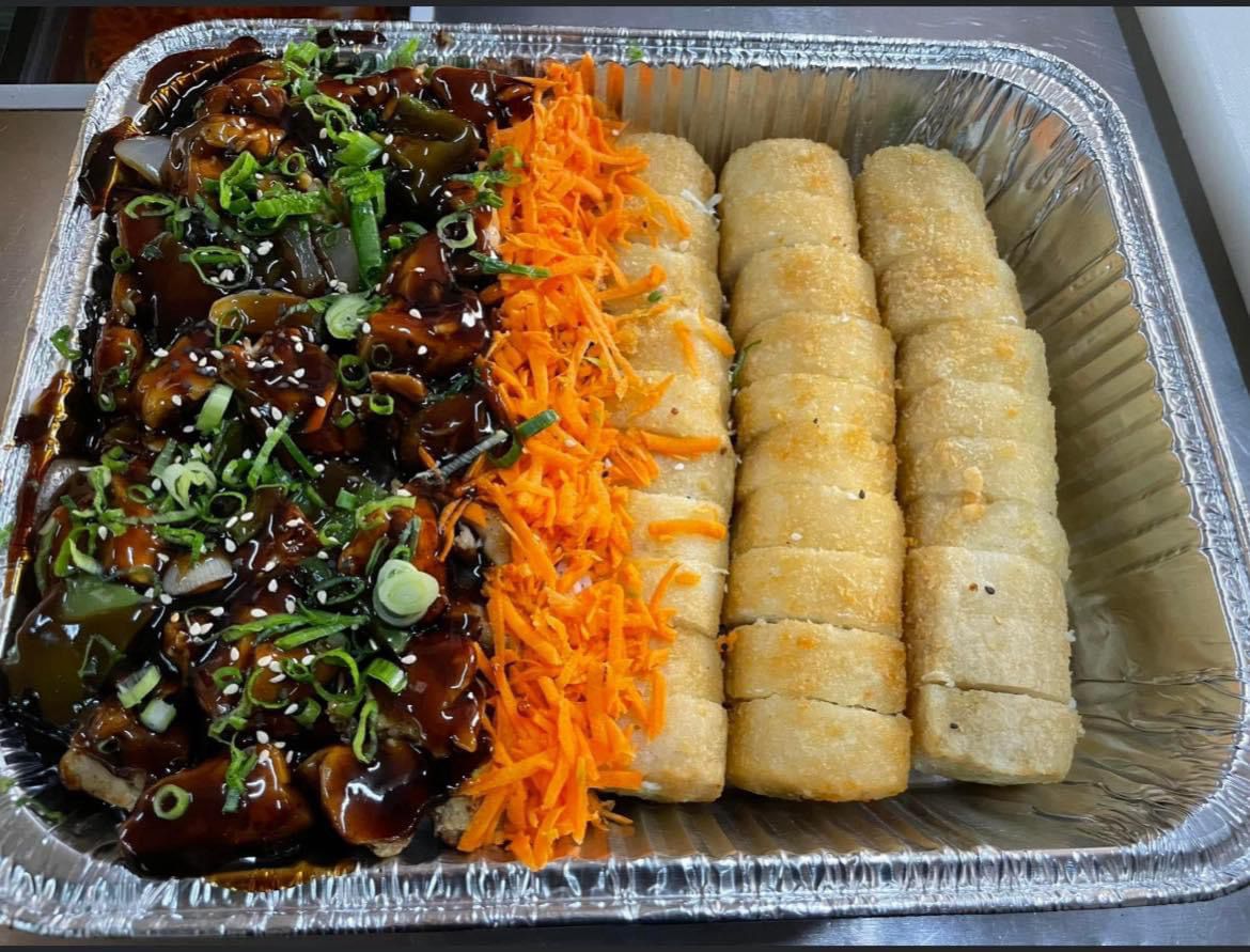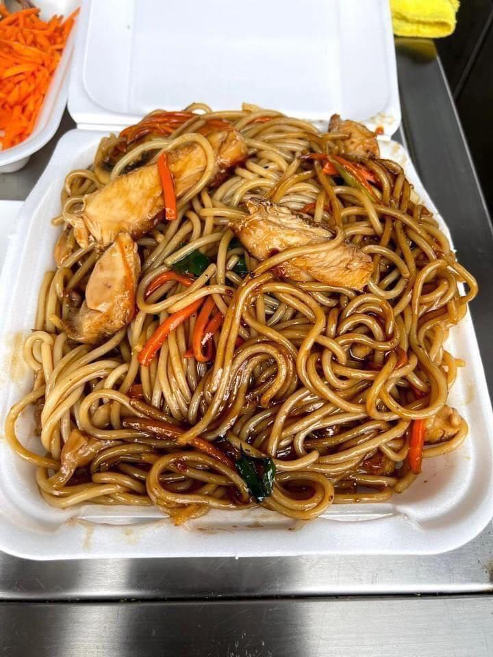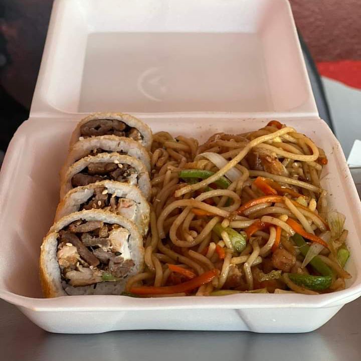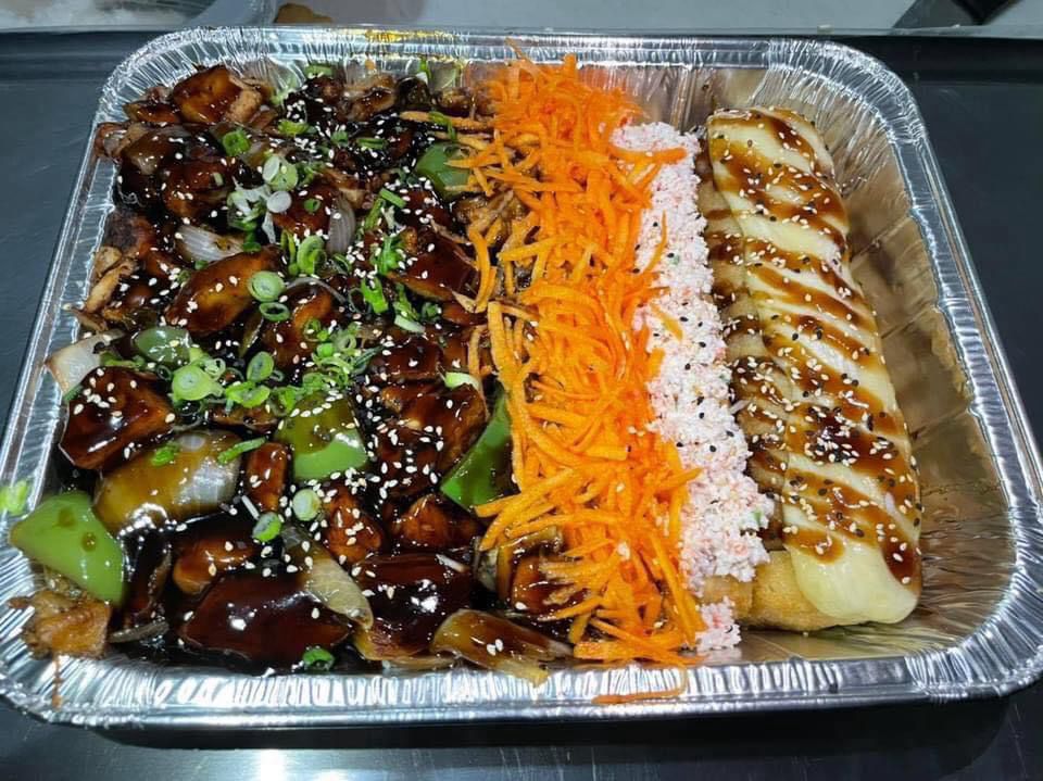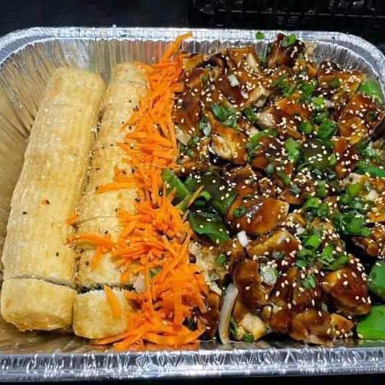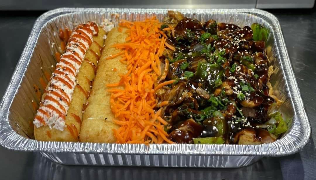 Teriyaki de pollo, yakisoba de pollo y 2 rollos empanizados de camaron