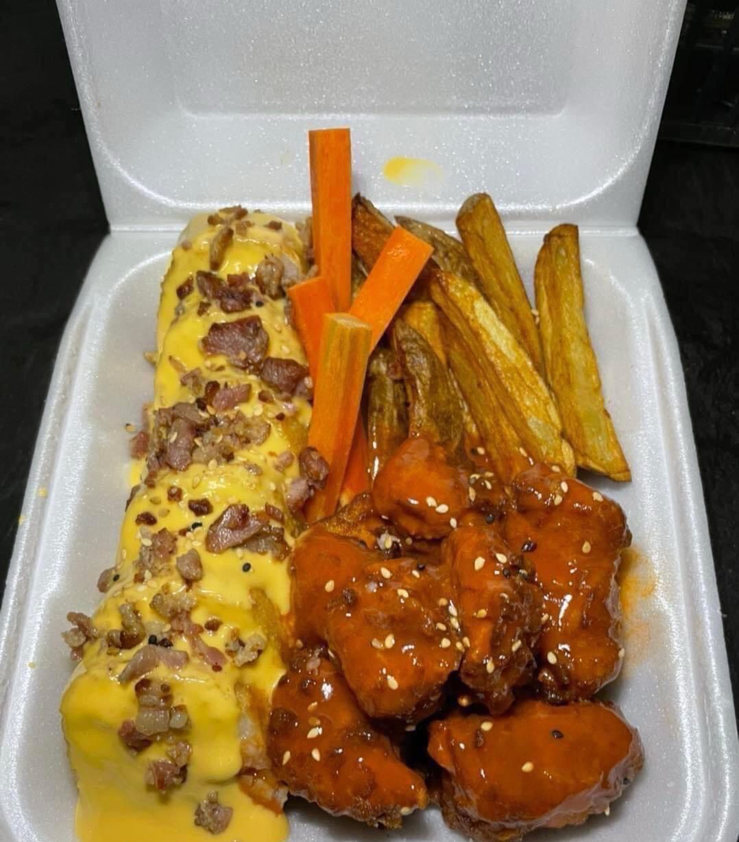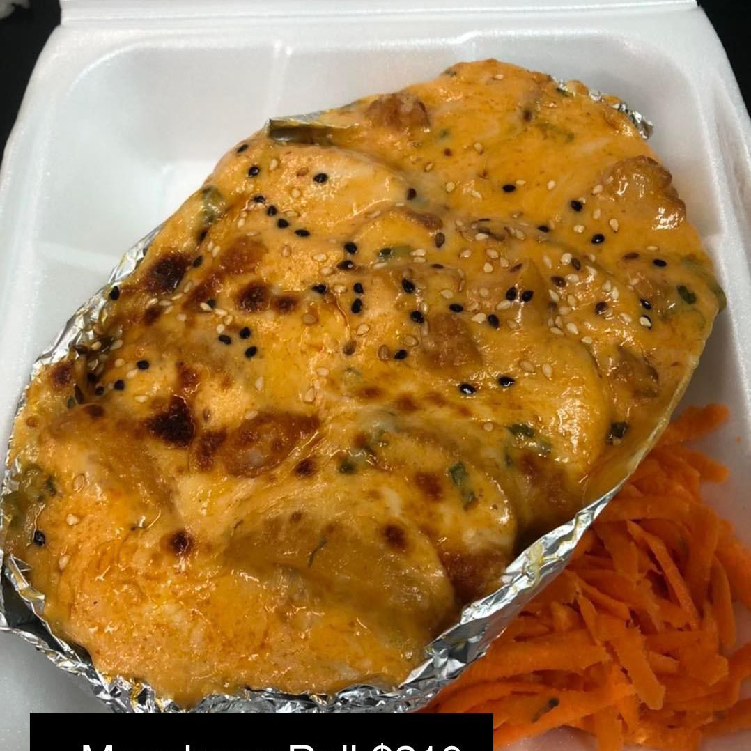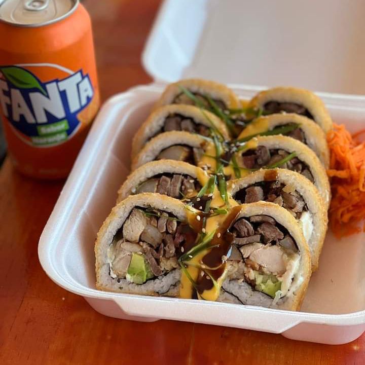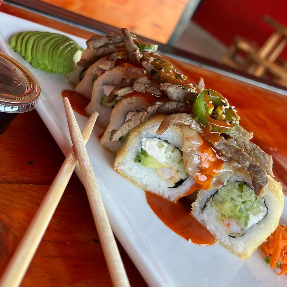 1/2 teriyaki de pollo mas una sushibola a elegir (res,pollo, camarón ) gratinada con tocino, cebollín y salsas de la casa acompañada de un toreado
