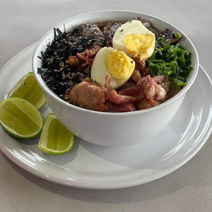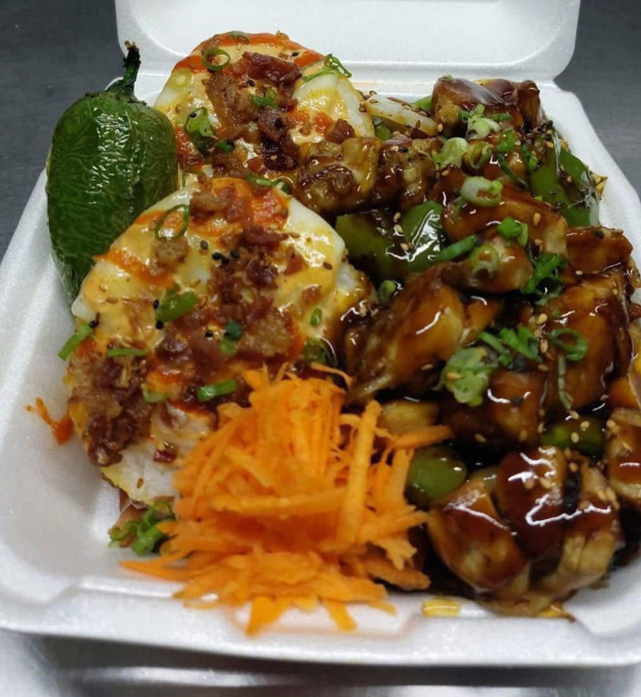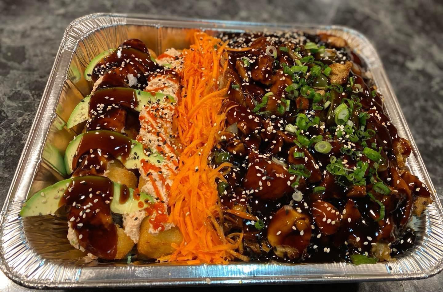 1/2 teriyaki de pollo mas una sushibola a elegir (res,pollo, camarón ) gratinada con tocino, cebollín y salsas de la casa acompañada de un toreado