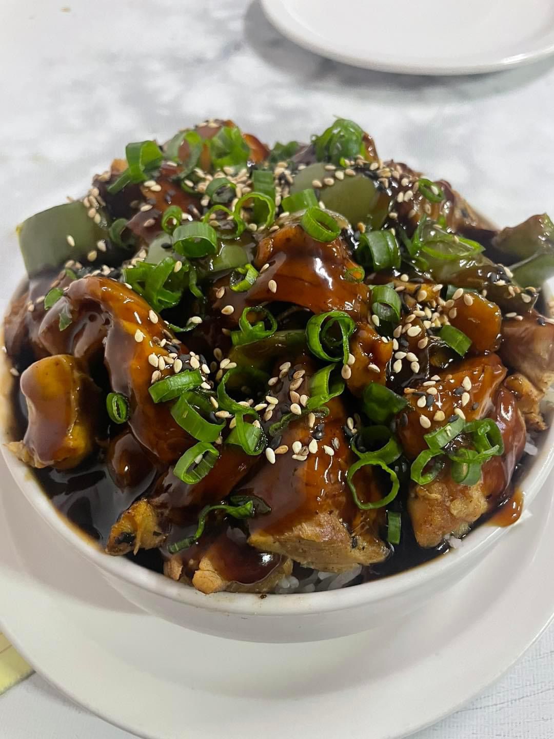 Cama de arroz blanco, pollo, morron, cebolla y salsa teriyaki