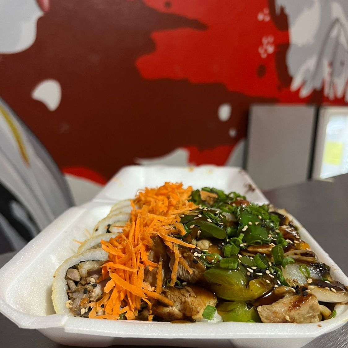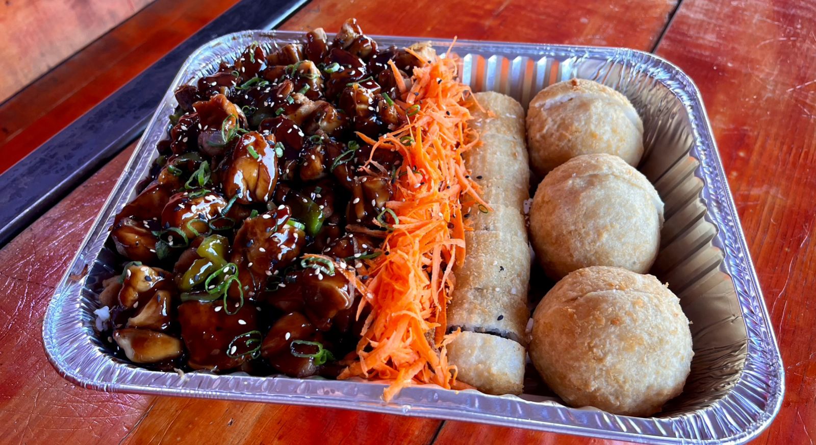 teriyaki de pollo mas un rollos California de camarón y 3 sushibolas de pollo
