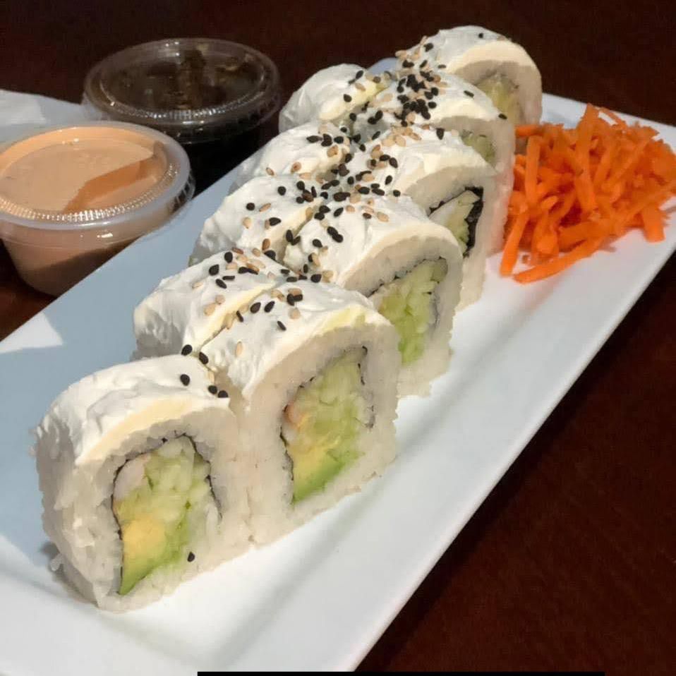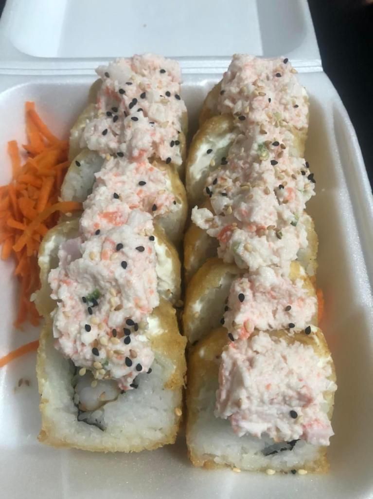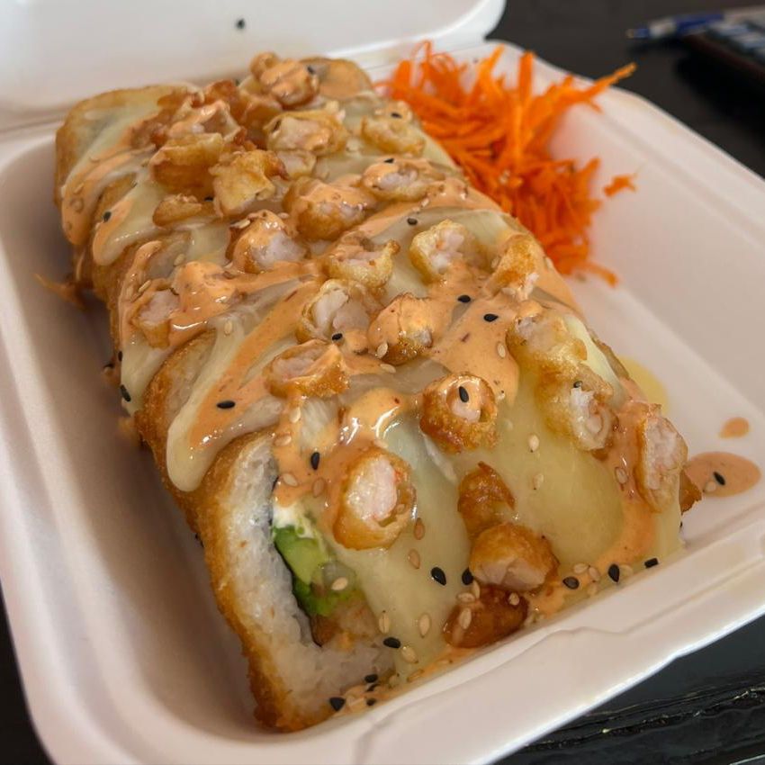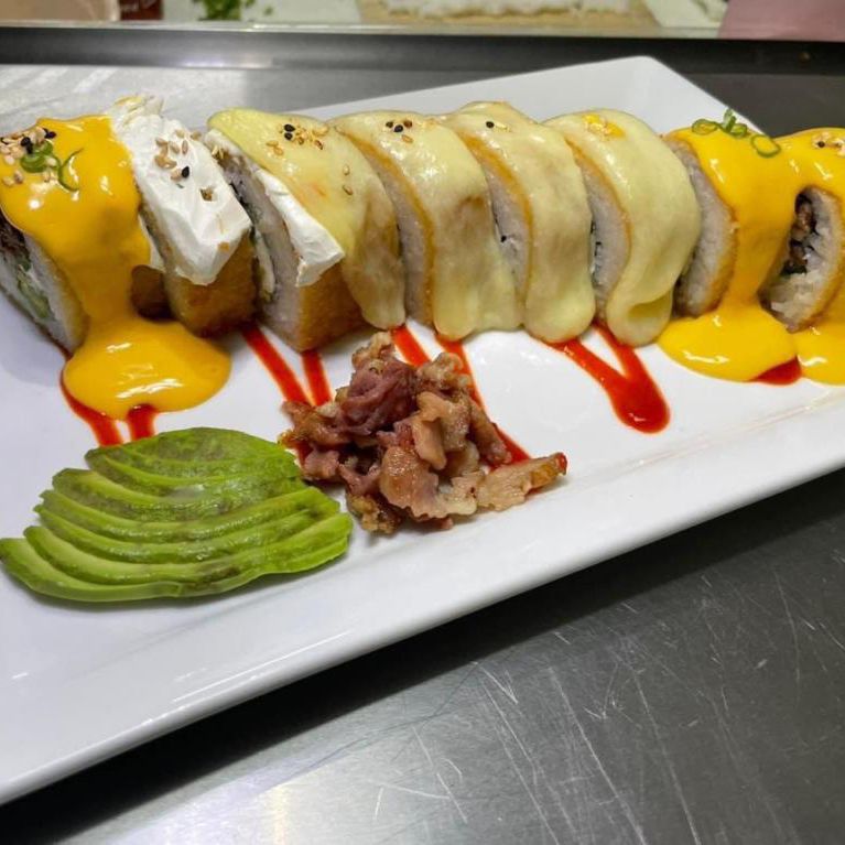 Camaron, aguacate, pepino, queso philadelphia, empanizado, gratinado con queso monterrey y camarones empanizados y bañado con aderezo chipotle