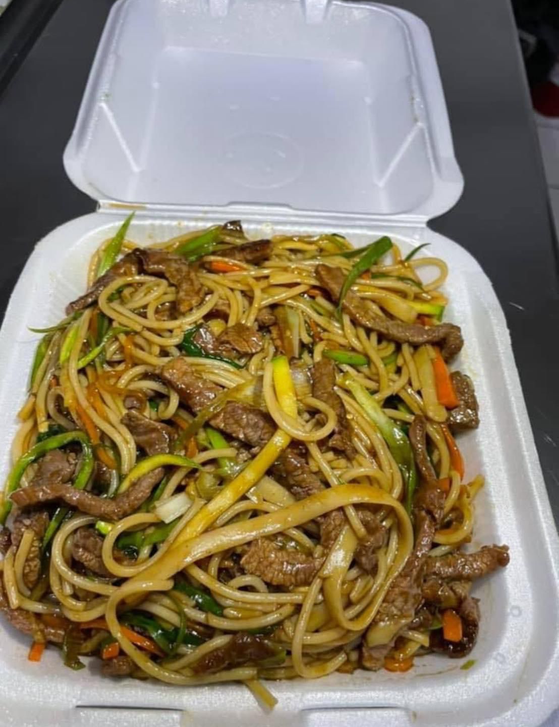 Pasta, res, zanahoria, calabacita, cebollin y salsa teriyaki