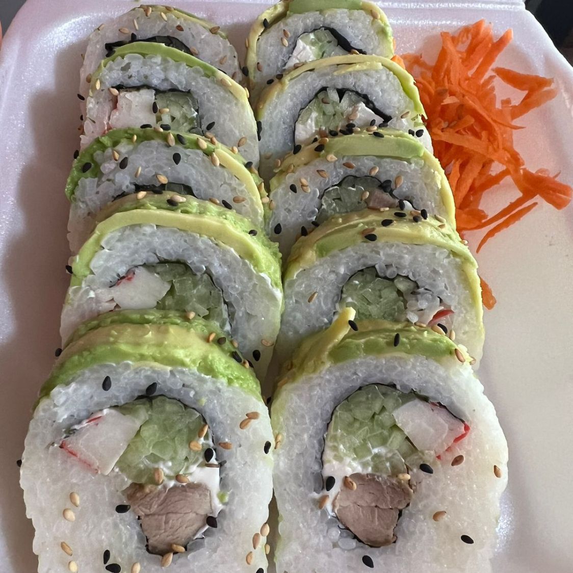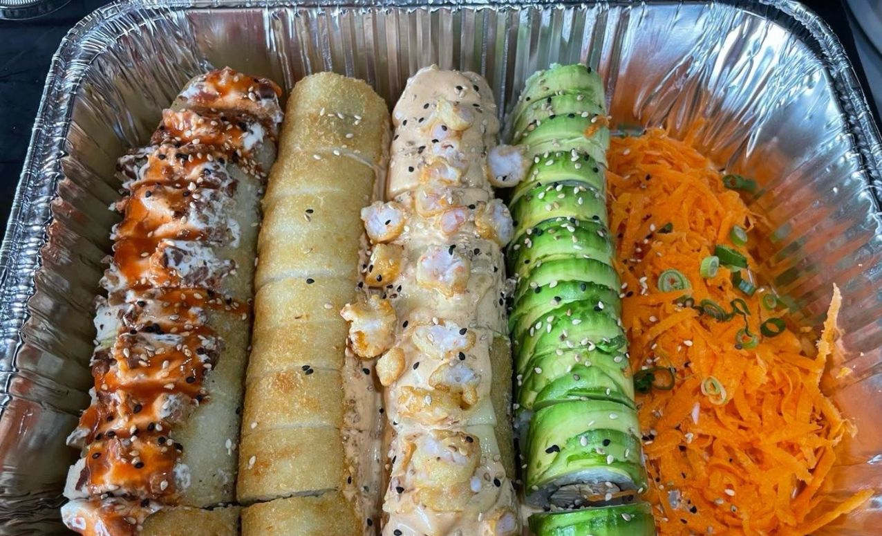 Incluye un chipotle Roll, un avocado Roll, un California de camarón y un Chesse ebi