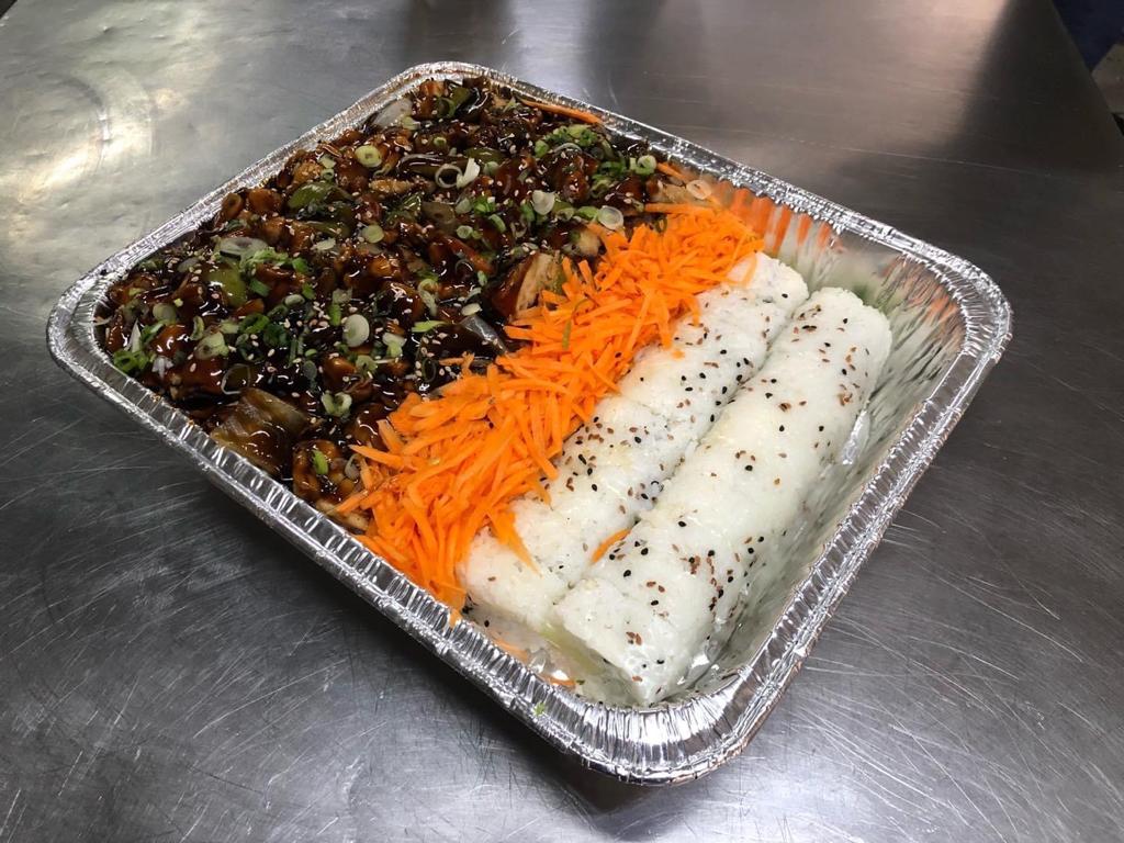 Teriyaki de pollo, arroz blanco, 1 rollo natural de camaron y 1 rollo natural de surimi