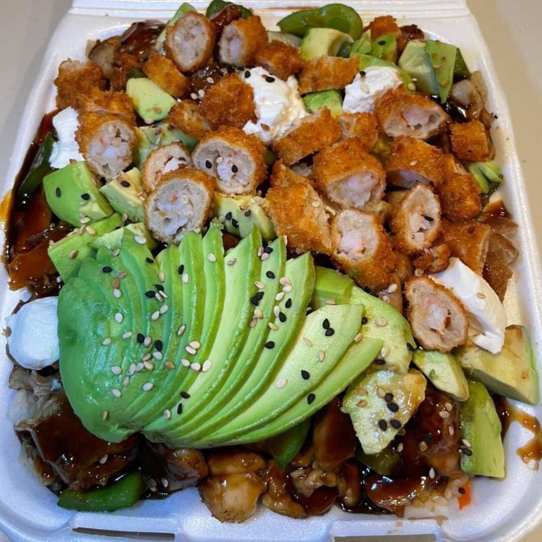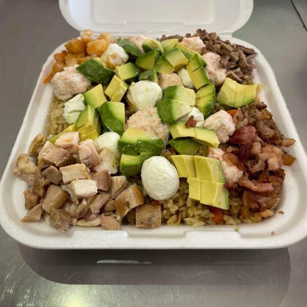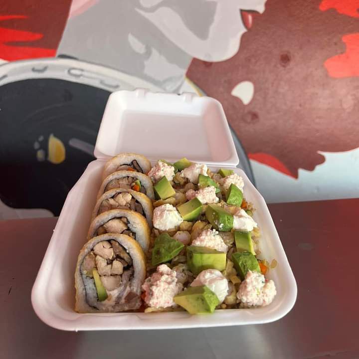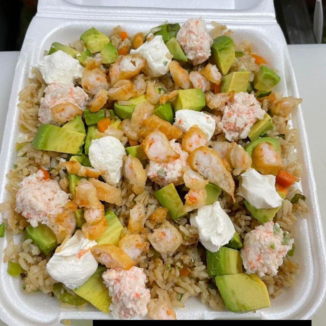 Arroz frito, tocino, pollo, res, camarones, philadelphia, aguacate y tampico