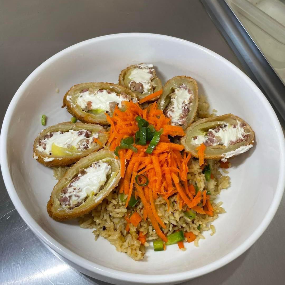 Arroz frito, camarones capeados, aguacate, philadelphia, tampico