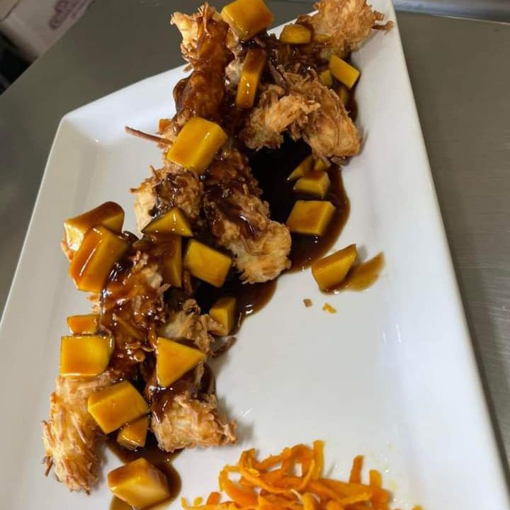 Capeados y forrados con coco rayado y bañados en salsa teriyaki con mango