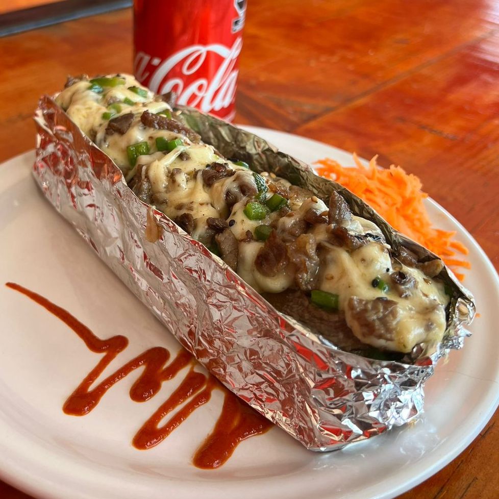 Philadelphia, aguacate, res y encima queso monterrey gratinado y peperoni